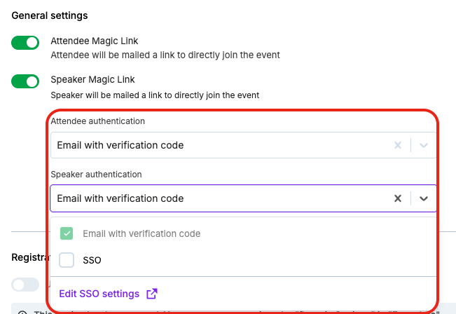 - Under the Attendee authentication options, select the authentication options you want to offer your attendees:
