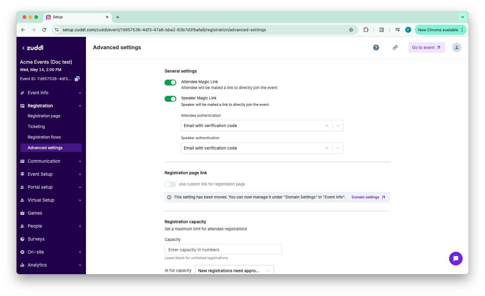 - Toggle on/off Attendee Magic Link. Enabling this will email attendees a link to join the event directly.