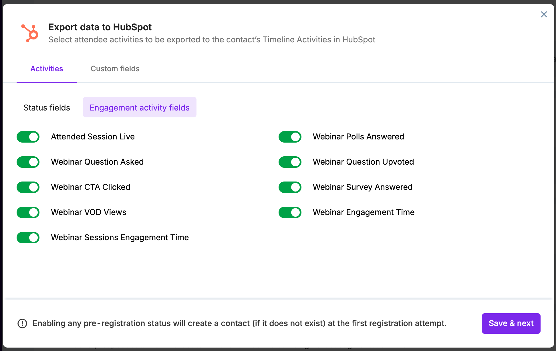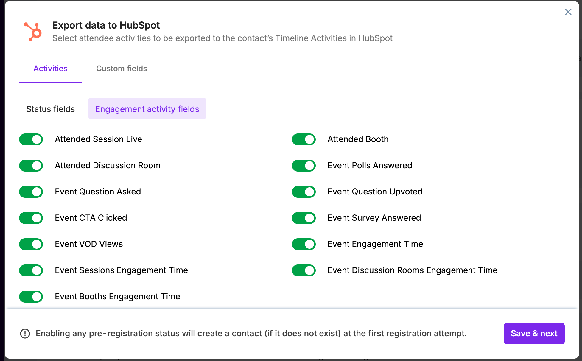 Under the Engagement activity field tab, toggle on the activities you want the integration to pass to your HubSpot account.