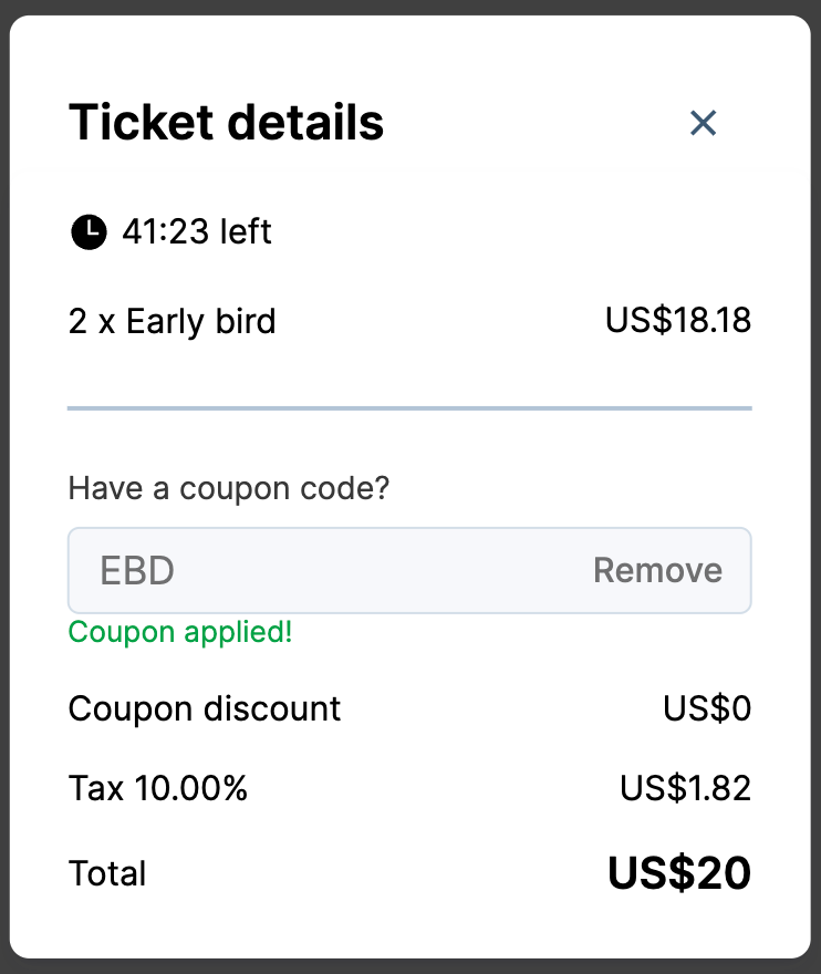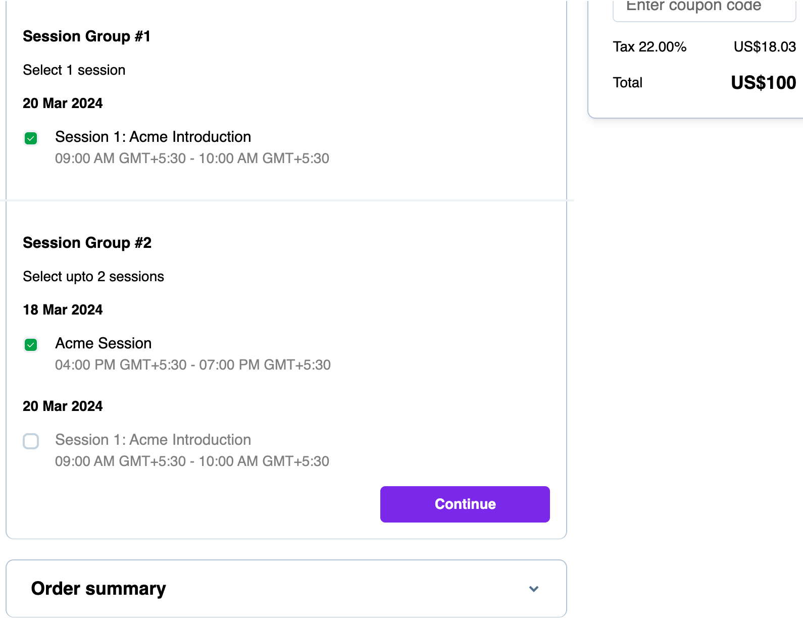Optional. The purchaser add a coupon applicable to the add-on and clicks Continue. You can create coupons exclusively for adds-on from the Coupons tab. Learn how to create coupons. The coupons will be applied once the purchaser selects the required add-on.