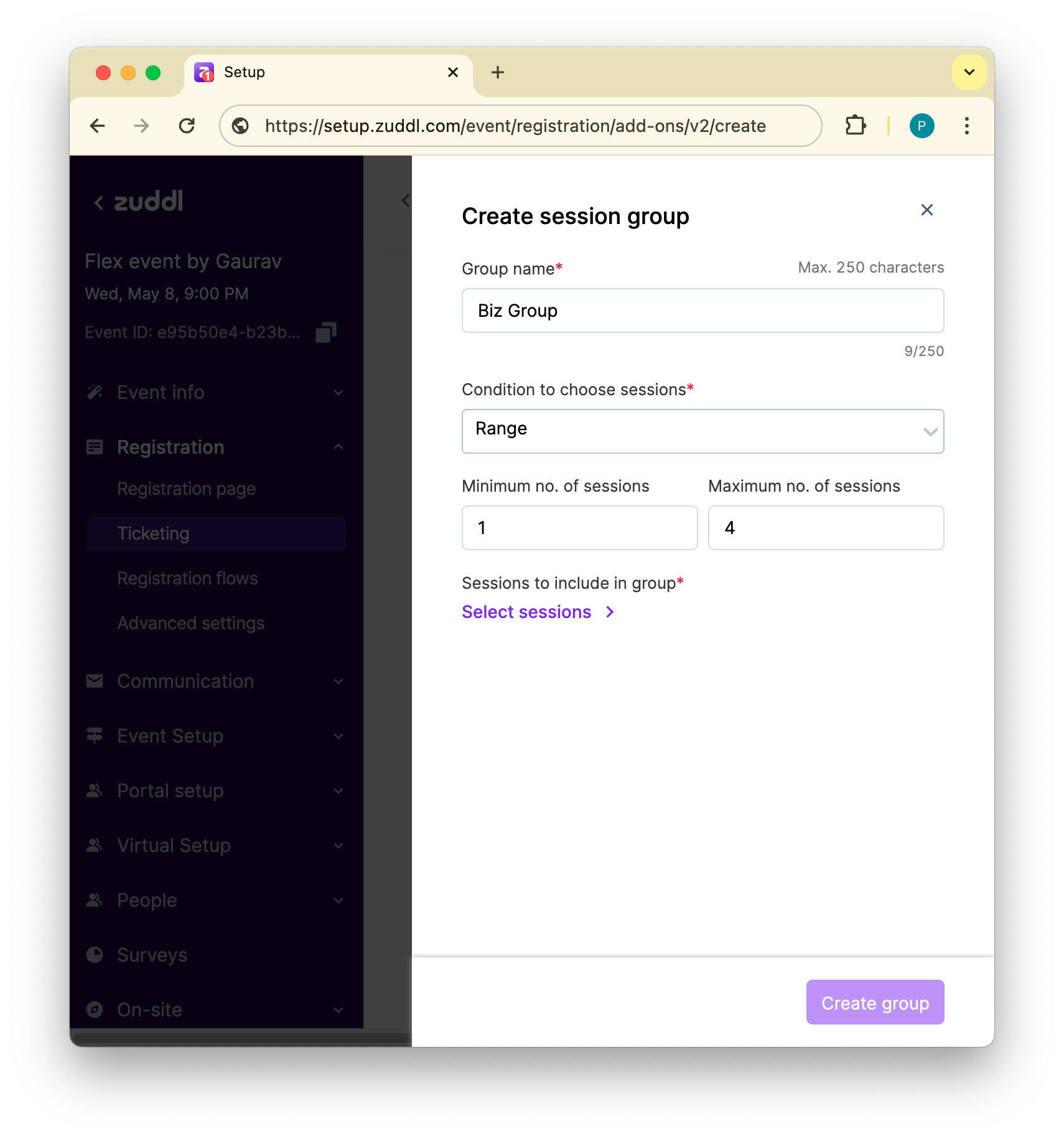 Under Session groups, toggle on Add sessions groups to this add-on. By adding session groups, you can bundle sessions together and allow users to choose sessions based on certain conditions.