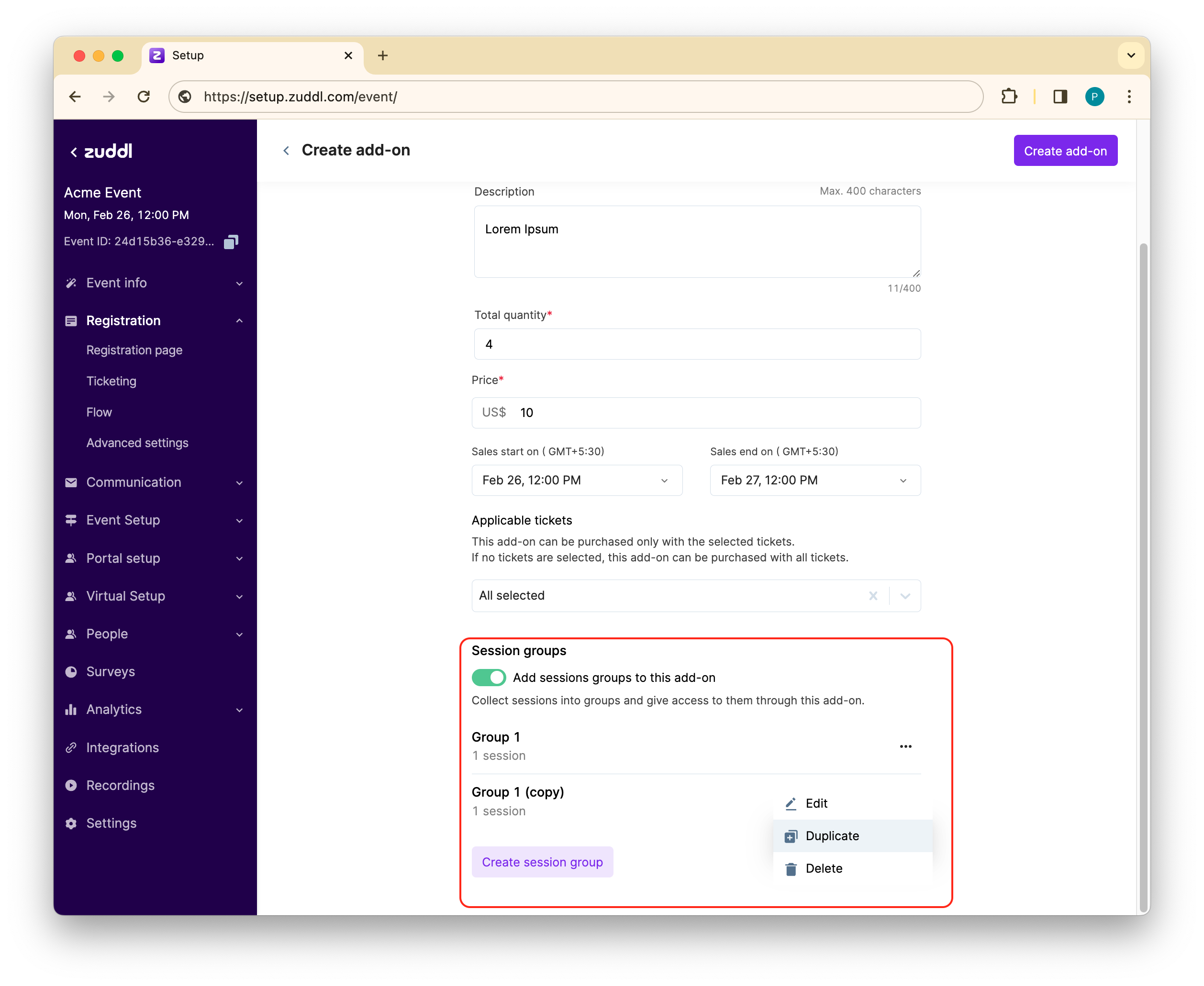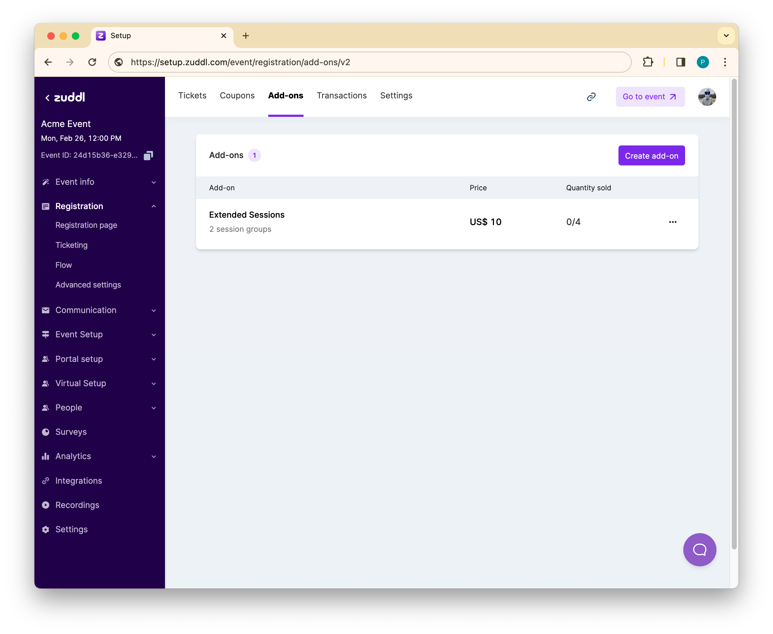 The following steps show how to create add-ons from the Ticketing tool in your Zuddl organizer dashboard.