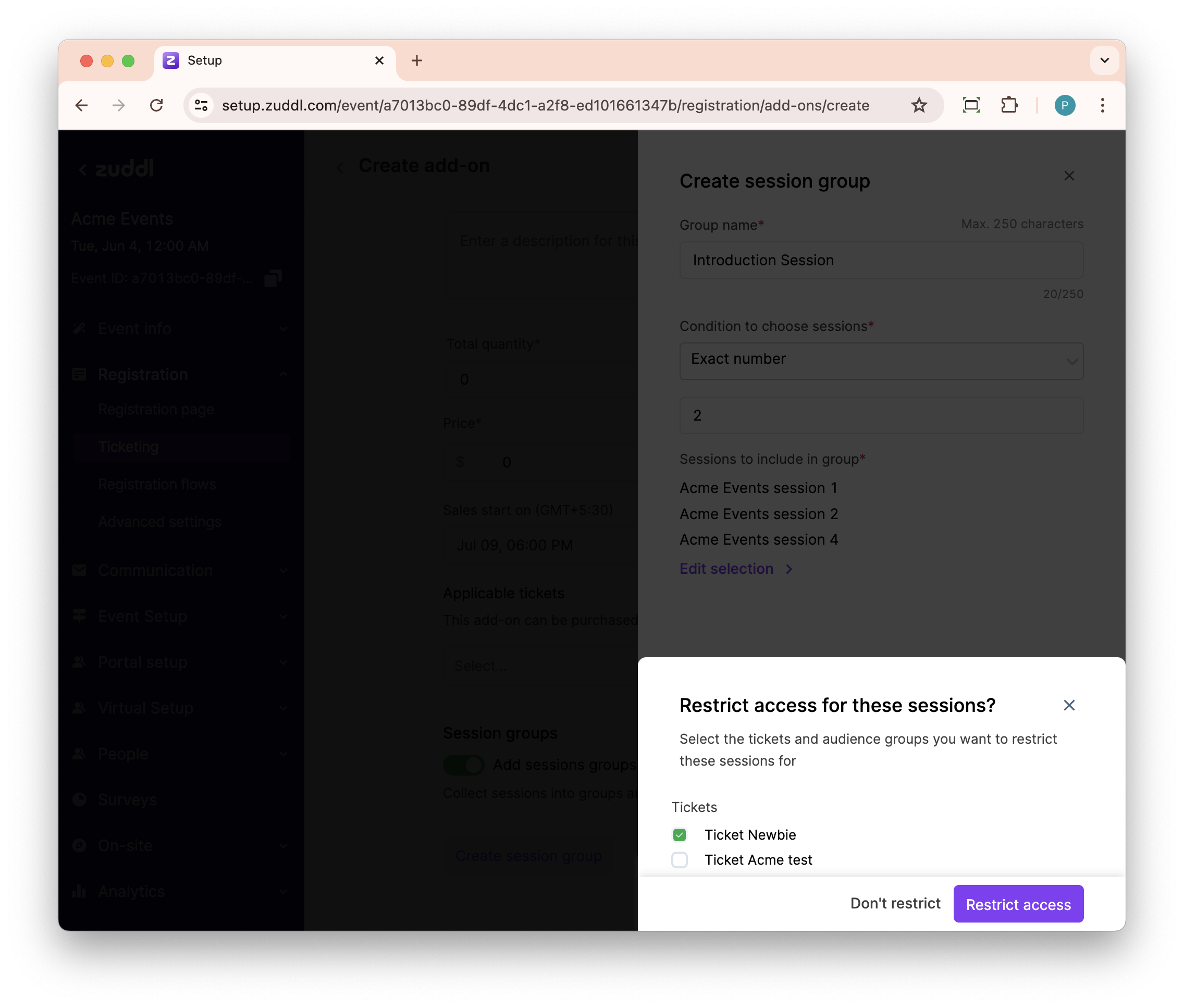 To restrict the sessions added to any particular ticket type, select the required ticket type checkbox under the Restrict access for these sessions prompt.