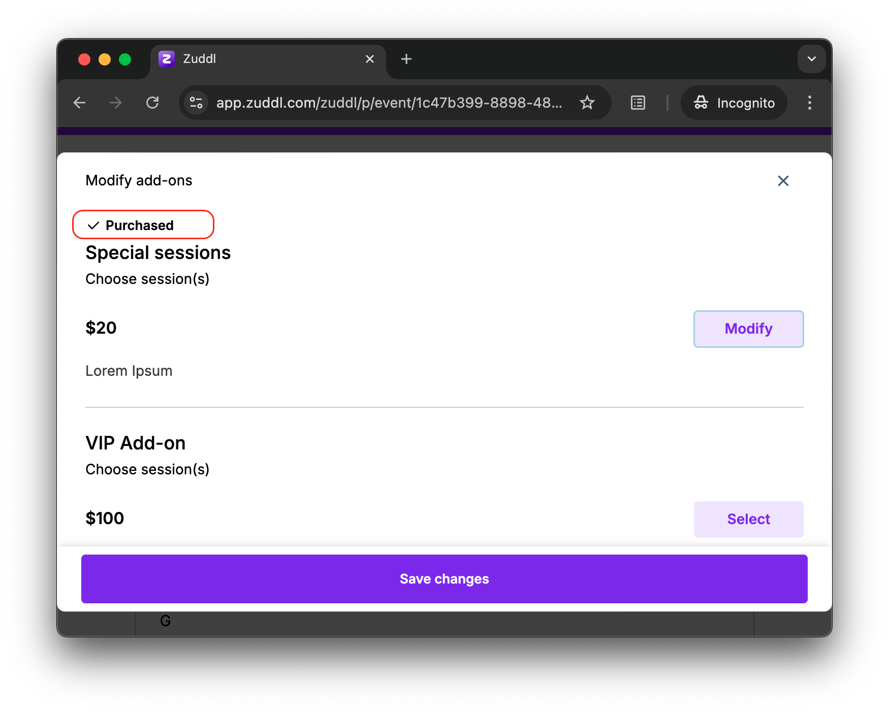 Purchaser can also click Modify to reselect sessions in an add-on.