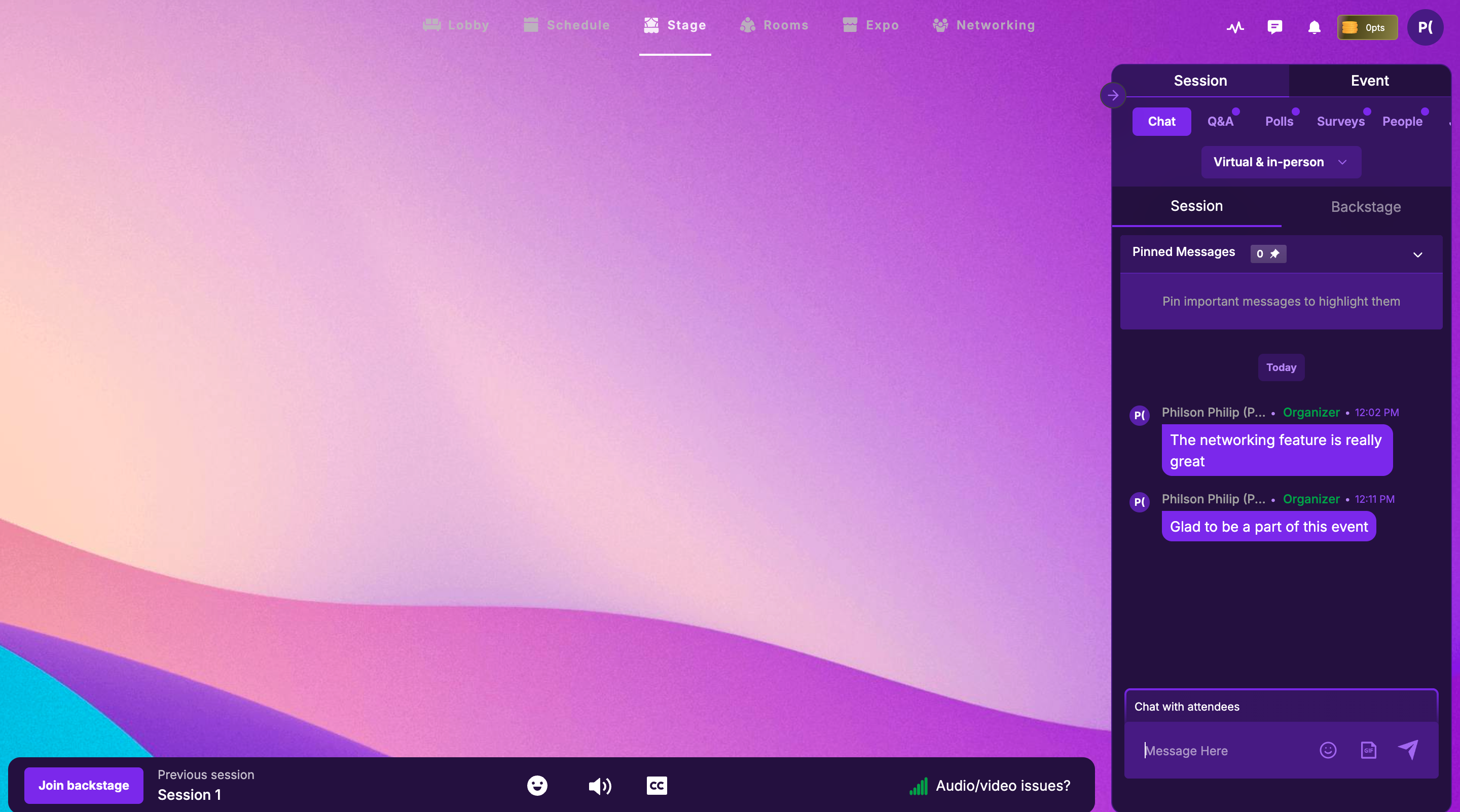 Chat is an essential feature in any event which allows attendees to send text messages to anyone (fellow attendees, speakers, and organizers) in an event and increase engagement between attendees. You can enable attendees to chat with other attendees, speakers, and organizers in an event-wide chatroom. Chat messages are visible to everyone at the event. The Chat tab can be found on the sidebar as shown below.