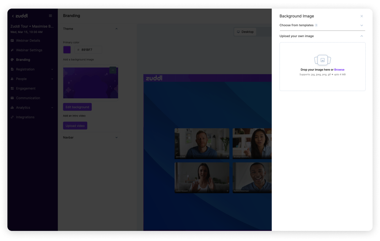 Make sure you upload a high-resolution 1920 x 1080px image. Make sure you design it keeping in mind the sidebar and the center webinar video container.