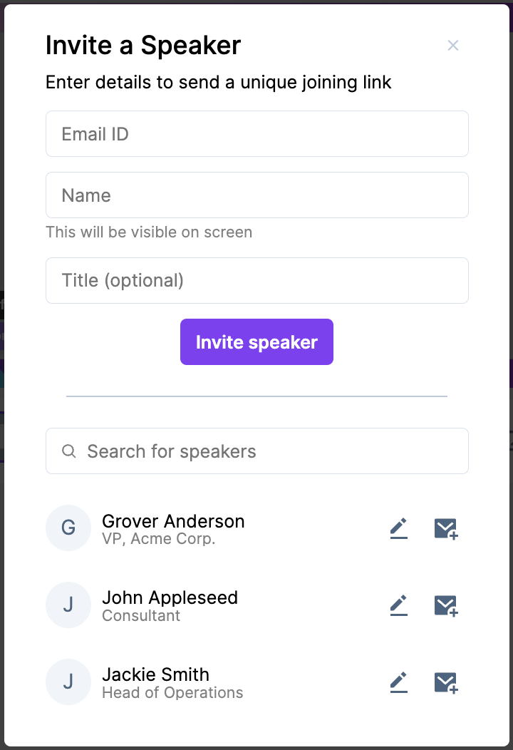 The invited speakers will be sent an email with a unique link to join your Studio.