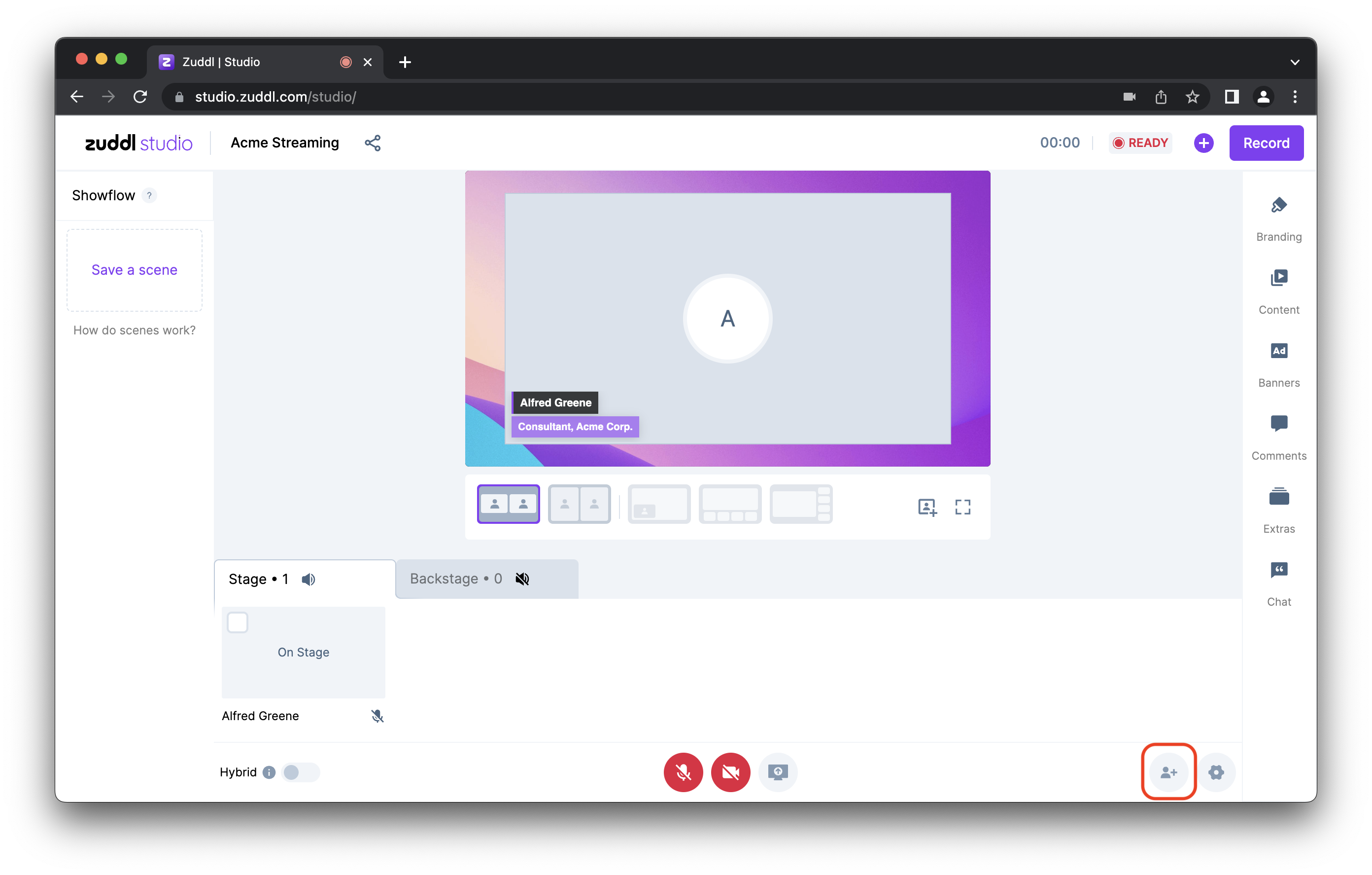 To invite speakers to join your Studio streaming session, start by clicking the Invite Speaker button in the lower right corner of the Studio dashboard.
