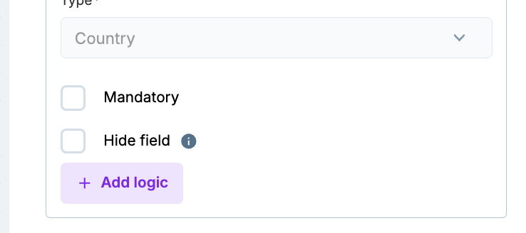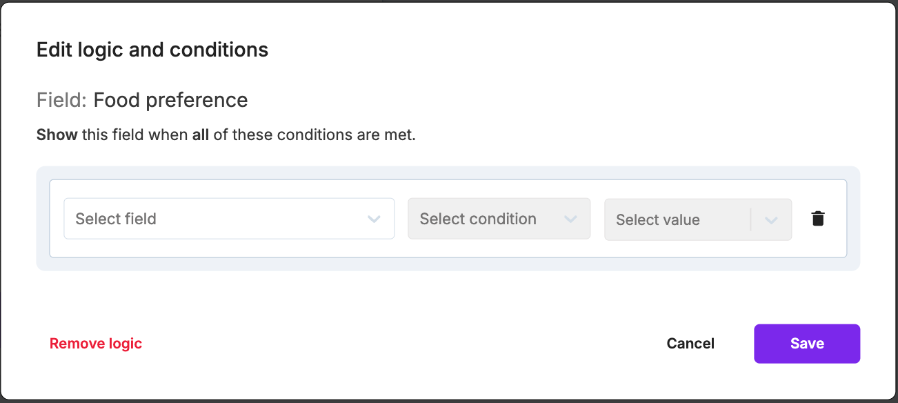 On the Edit logic and conditions modal, select a field from the list. Only those fields appear that come before this field (Food preference in the screenshot below).