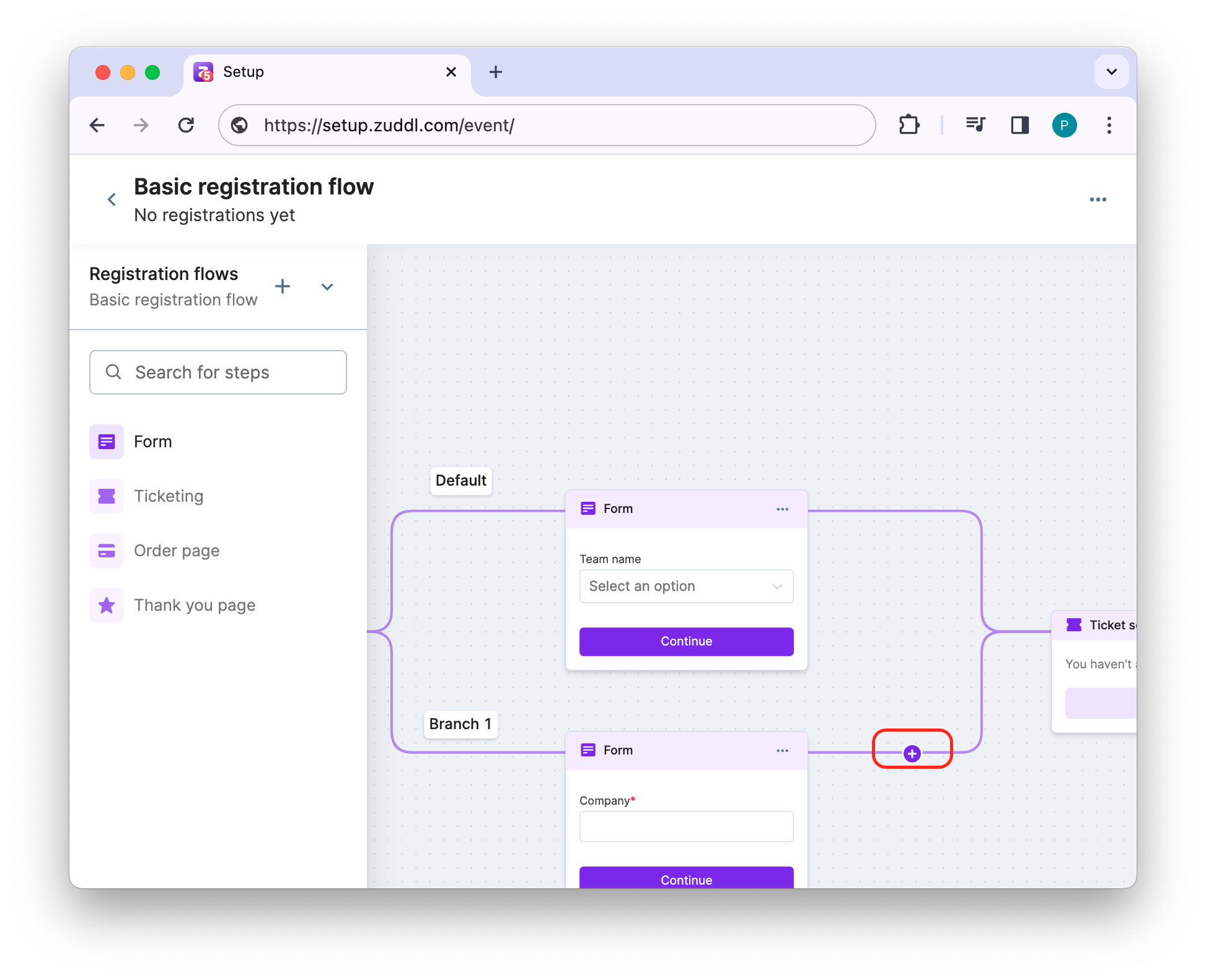 If you accidentally delete the Ticket selection and Order page. You can click on the + button in the connecting lines to add them back. The Order page step can only be added if the Ticket selection step is present.