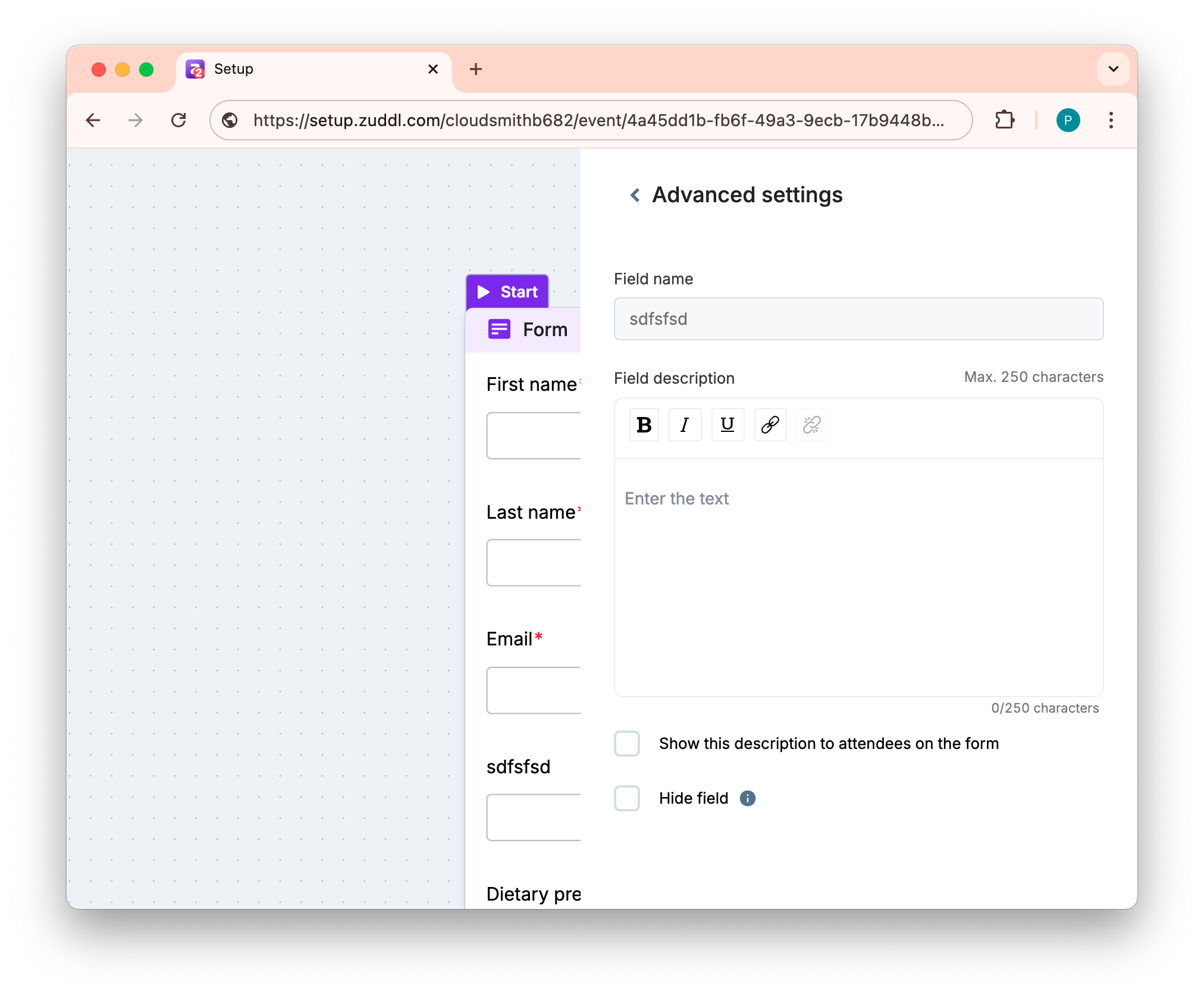 Select/clear the Hide field to hide or show it to attendees on the form.