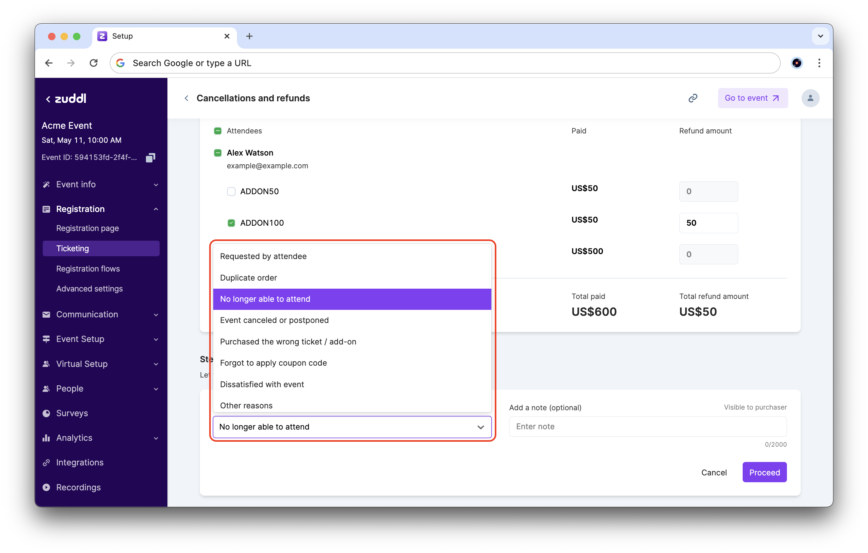 If a specific coupon discount has been applied to any item (tickets or add-ons), the actual Paid amount may vary. When refunding, please refer to the actual amount of the item after the applied discount.