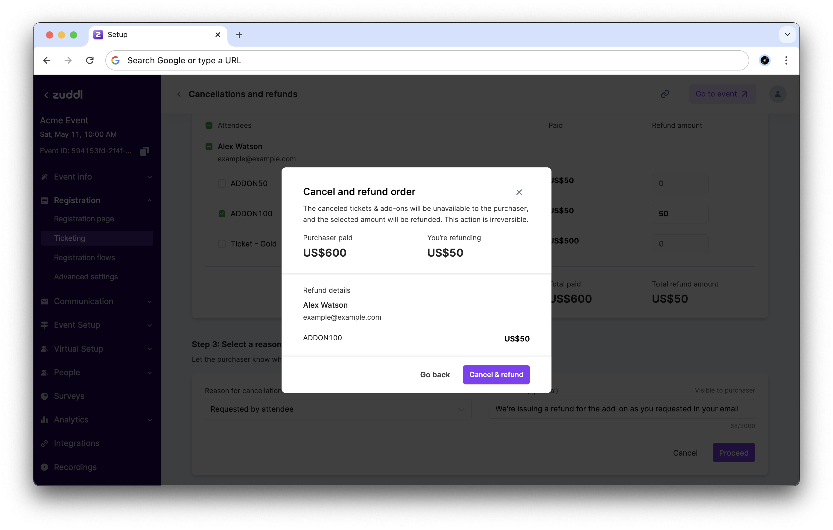In the popup, you can view the summary of your selected action. Review the details before continuing, and click Cancel & refund.