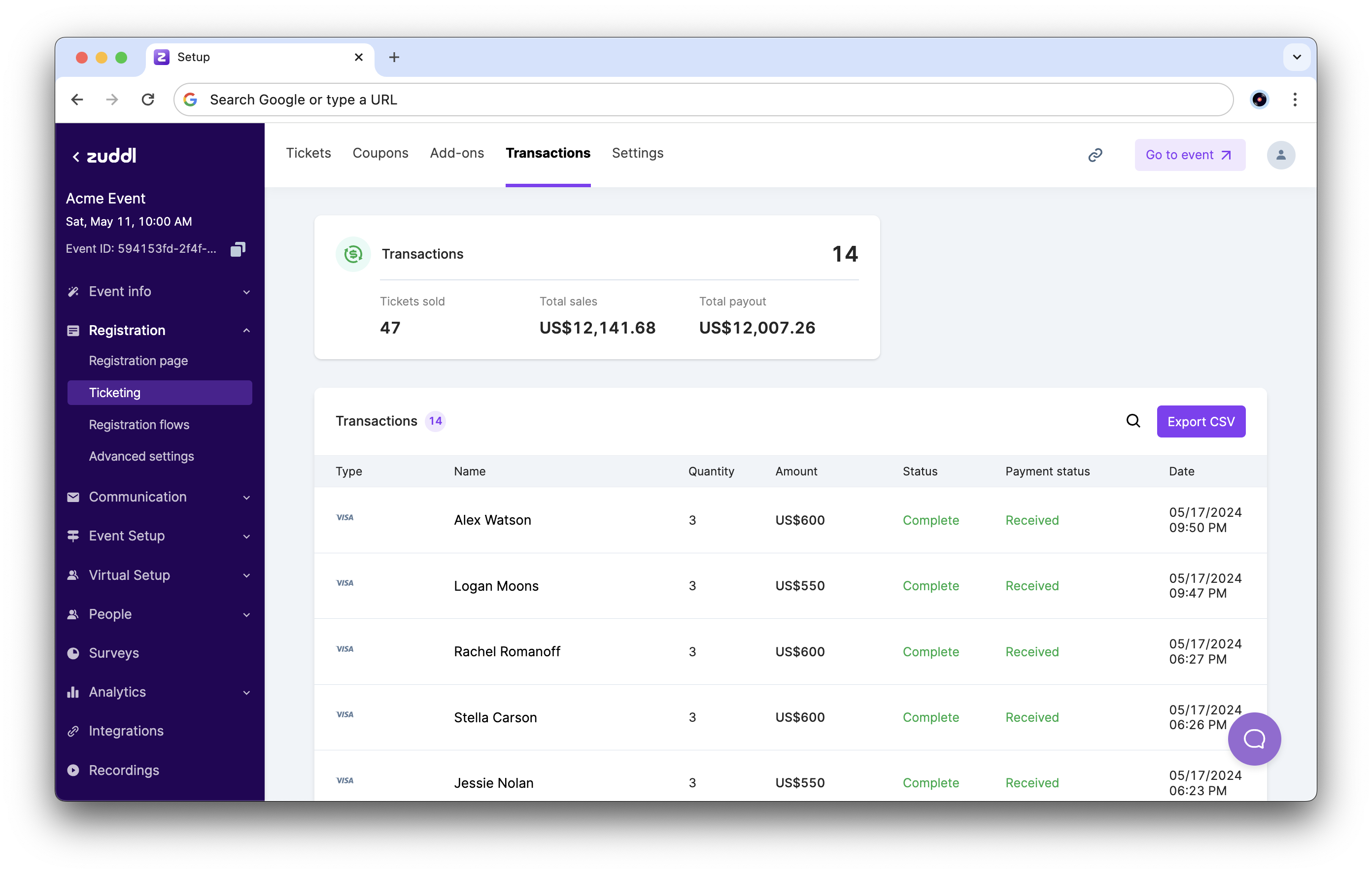 In the event setup, go to Registration > Ticketing. Click on the Transactions tab to see the list of transactions.