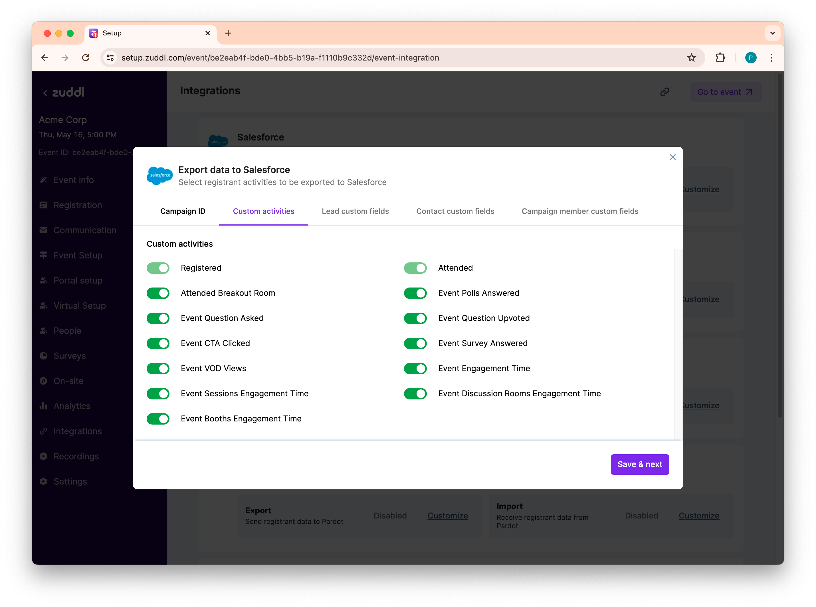 Toggle on the custom activities you want the integration to capture and send to your Salesforce account. The custom activities vary for virtual events and webinars. You can view the available custom activities for virtual events and webinars.