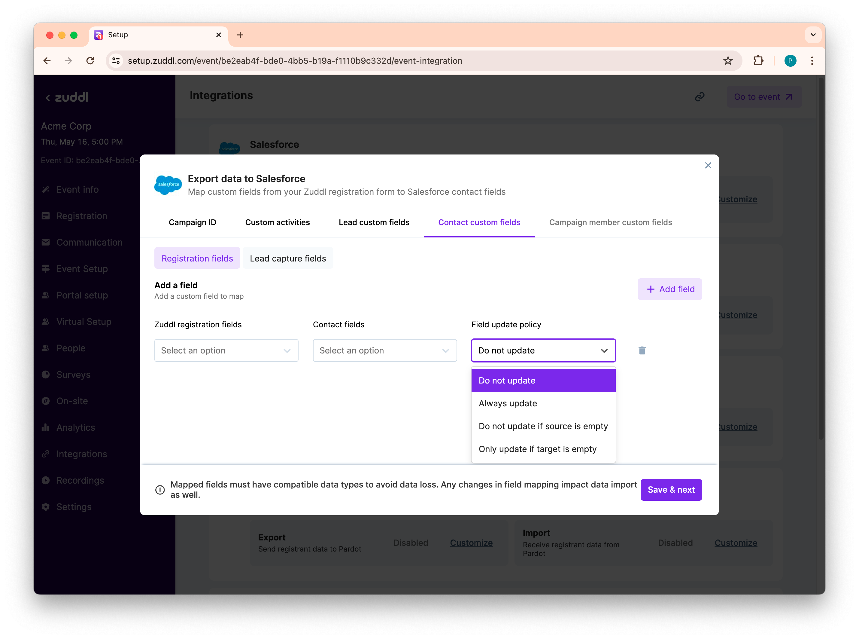 Do not update if source is empty: If the Zuddl field value is empty, this option does not pass the value of the Zuddl field to the mapped Salesforce field.