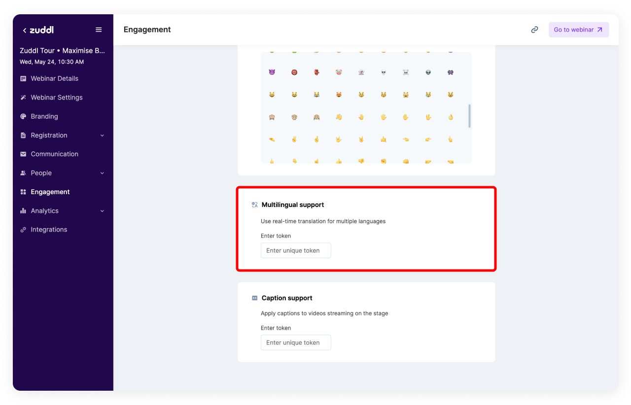 On the webinar setup, go to Engagement. Under Multilingual Support, enter the token you received from Interprefy in the Enter token field.