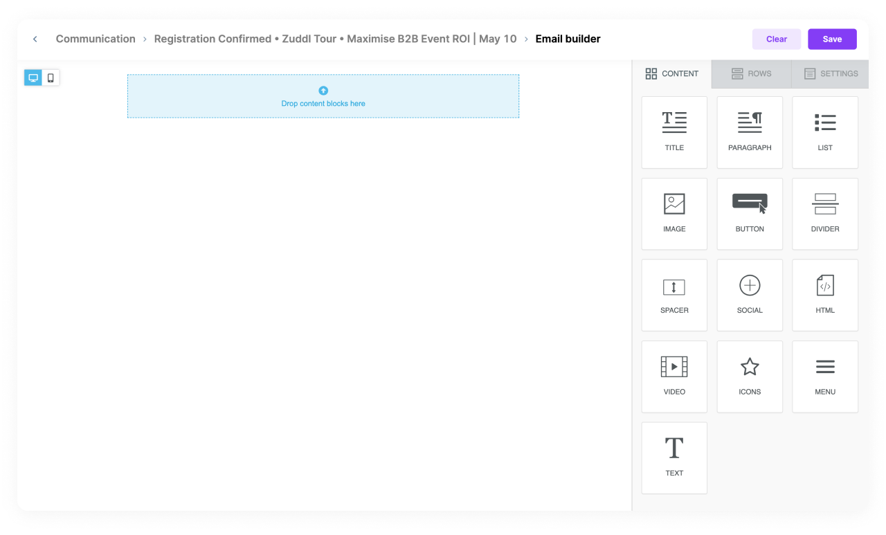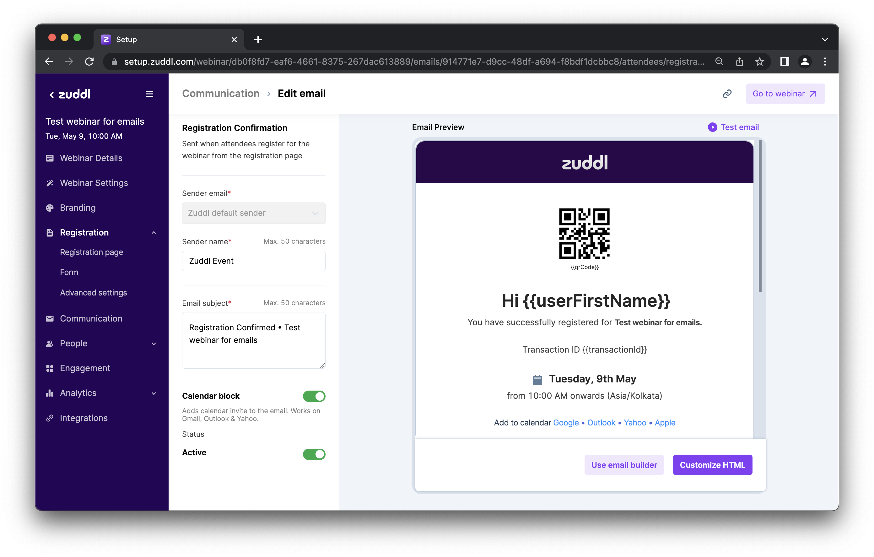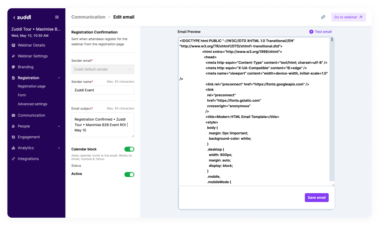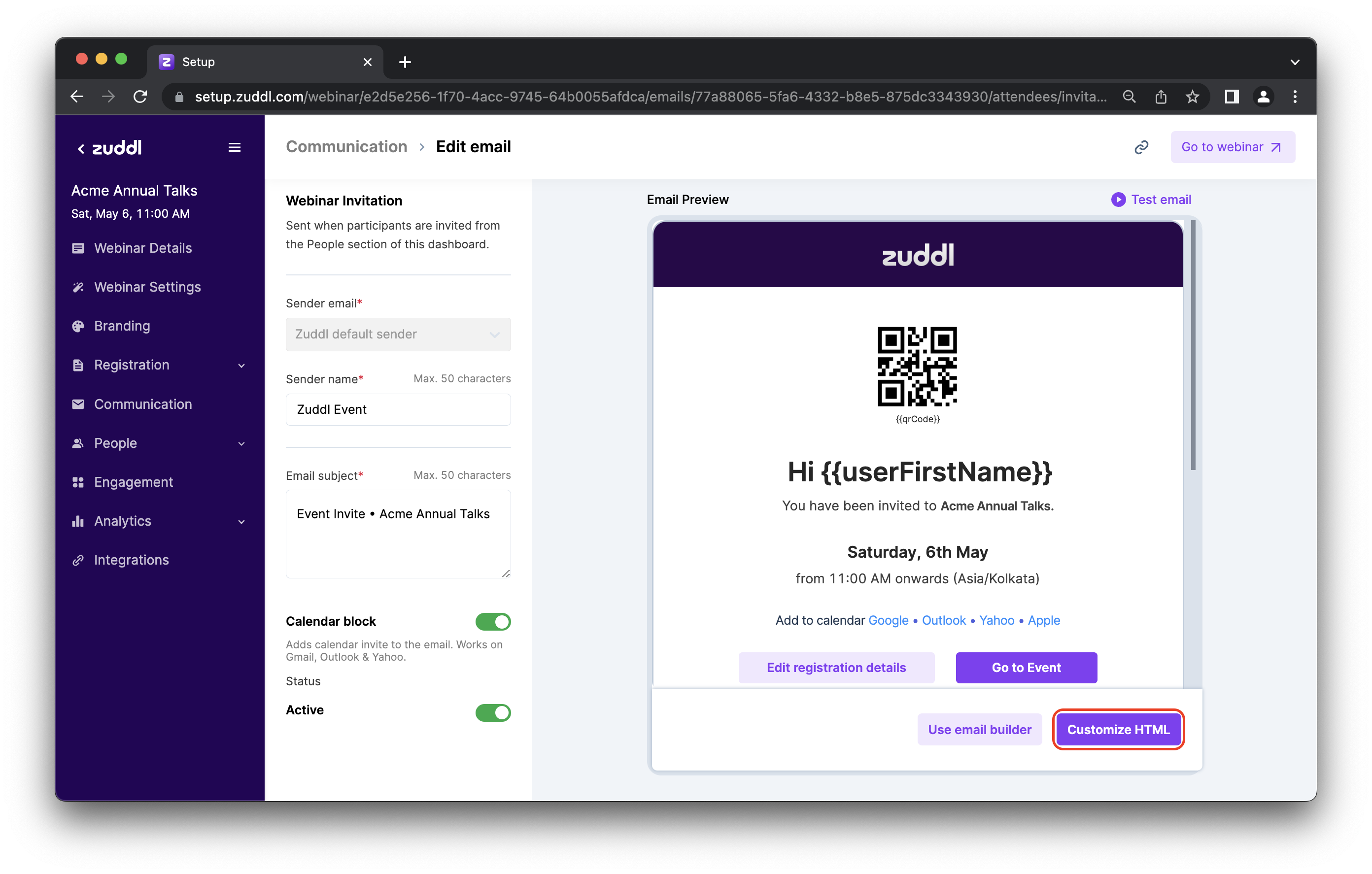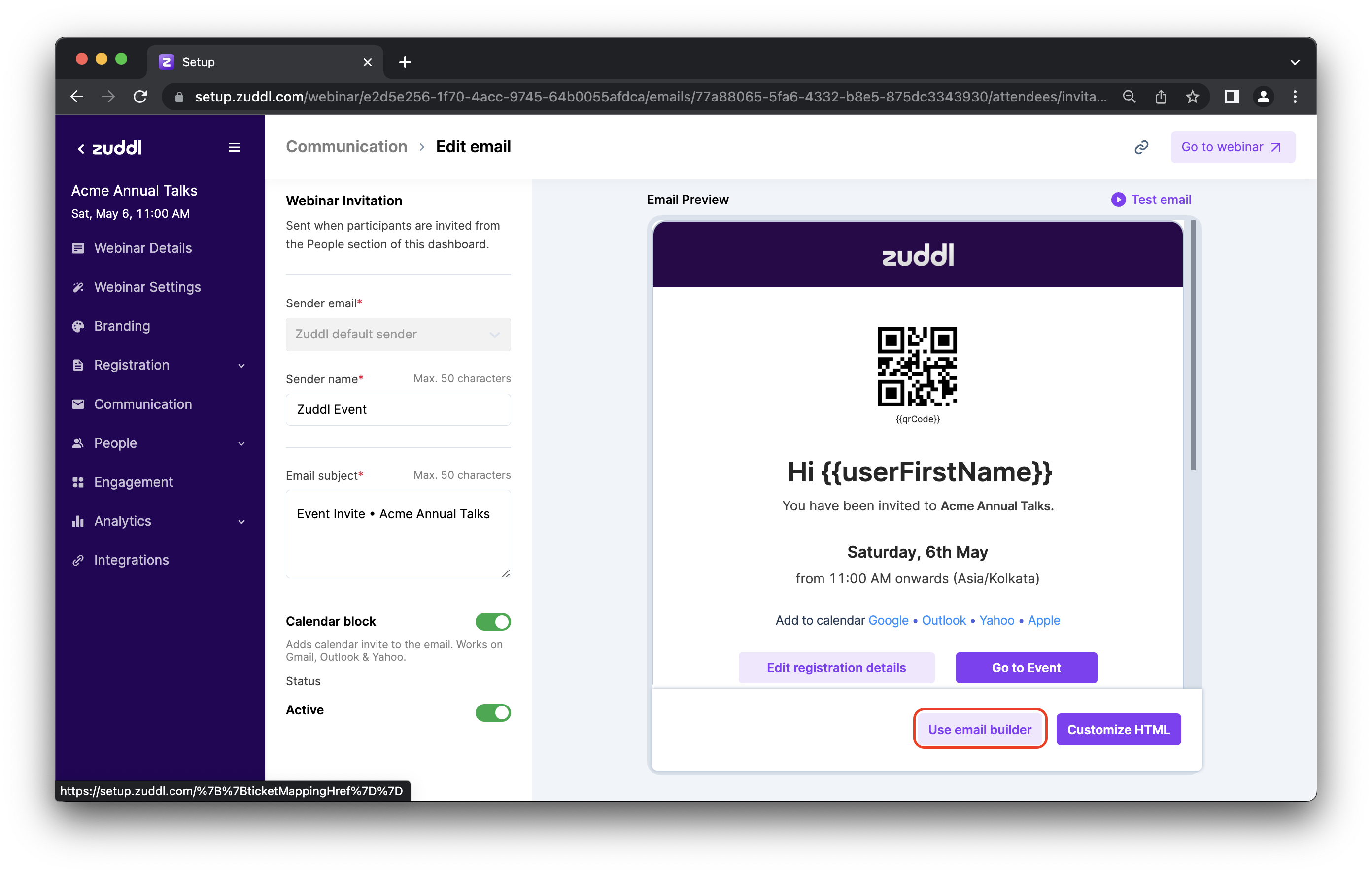 You can customize every email template available on Zuddl in two ways: by editing the HTML code of the template or by using the email builder.