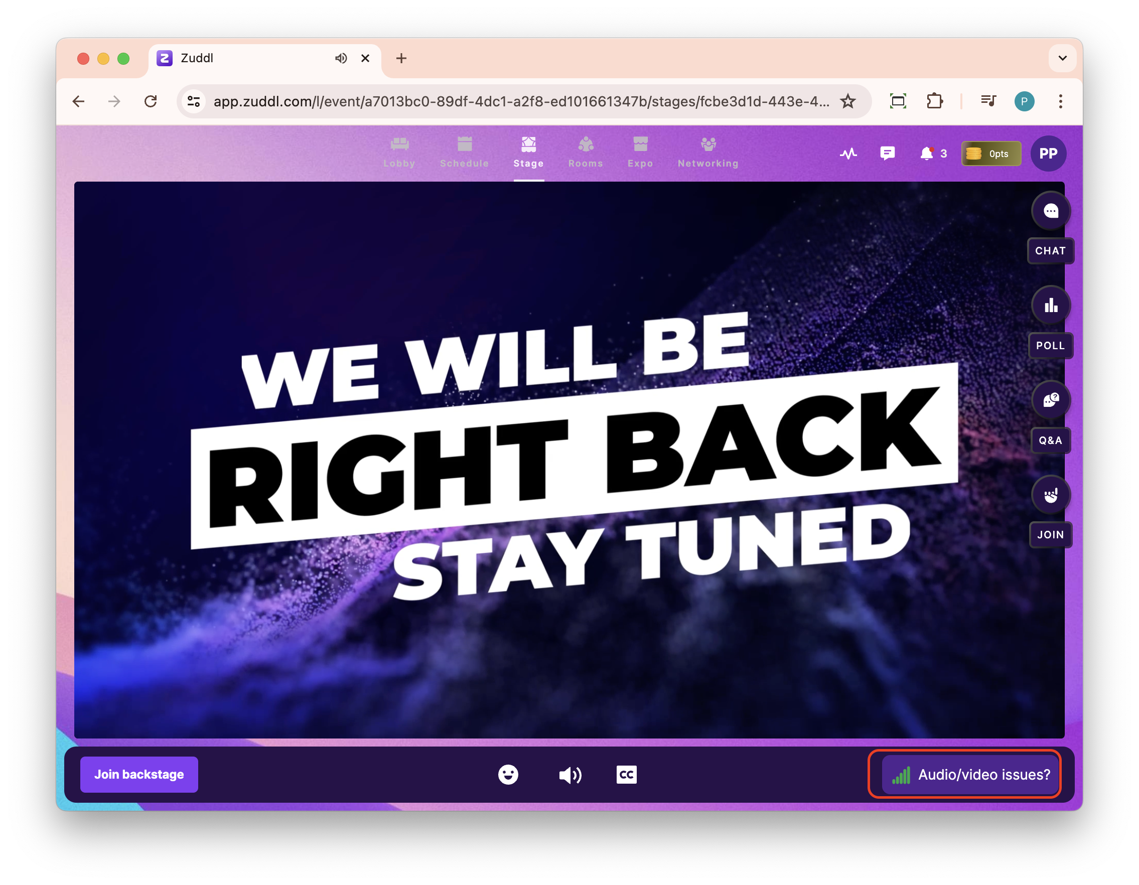 Click the Audio/video issues? button on the bottom bar