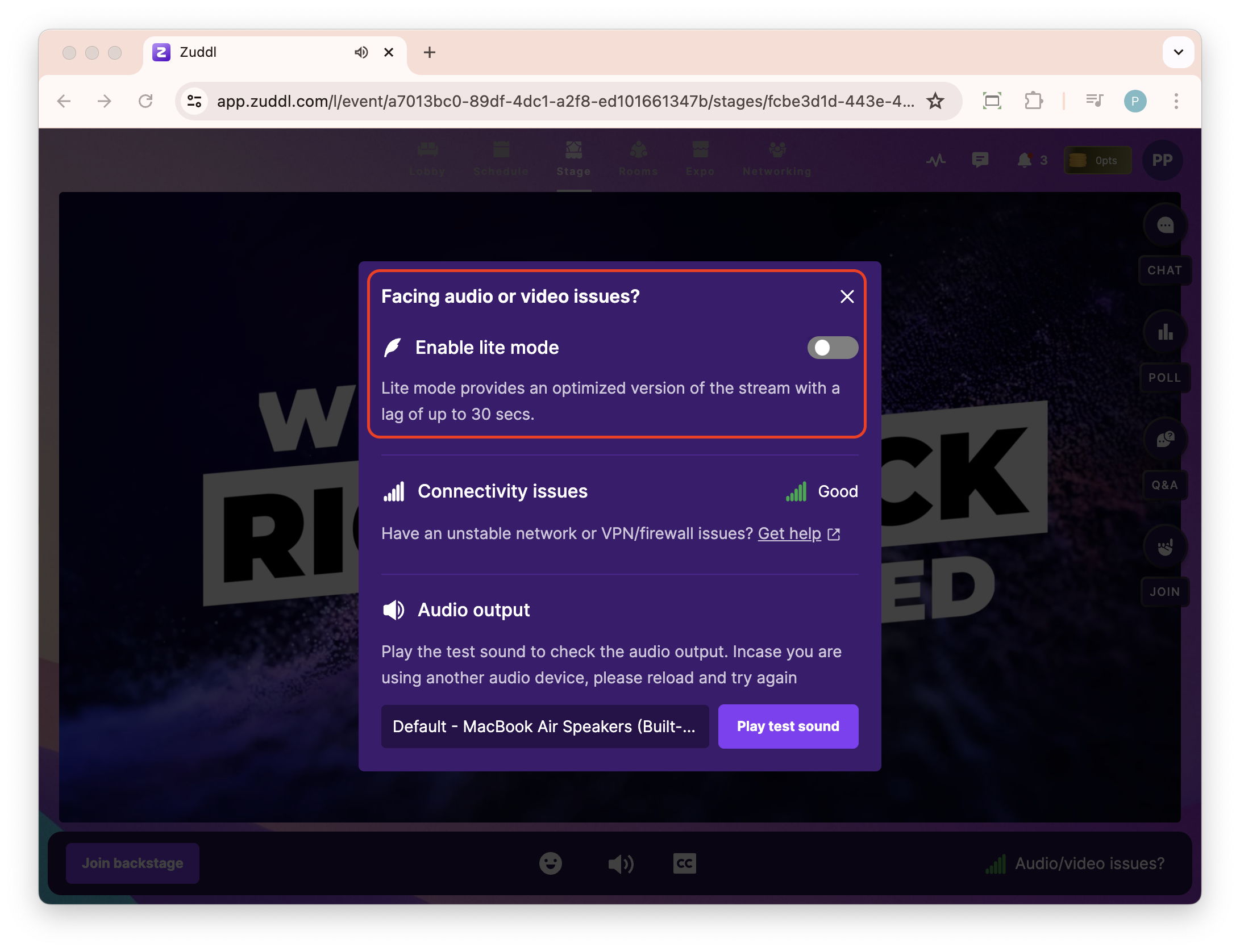 Lite mode is a lightweight version of the actual stream of a session so that if an attendee faces internet bandwidth issues, they can still be able attend the session.