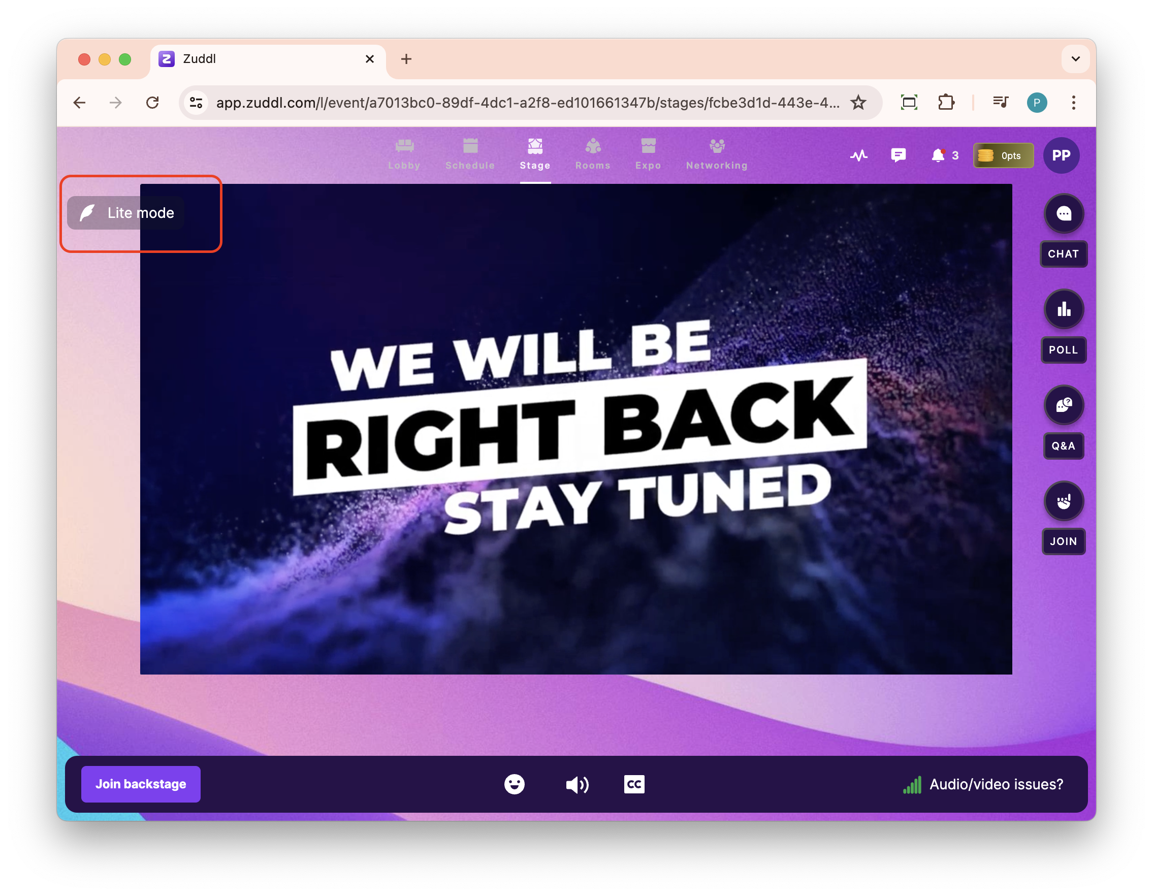 The attendee can easily identify if they are on lite mode by the label on the top left corner of the feed.