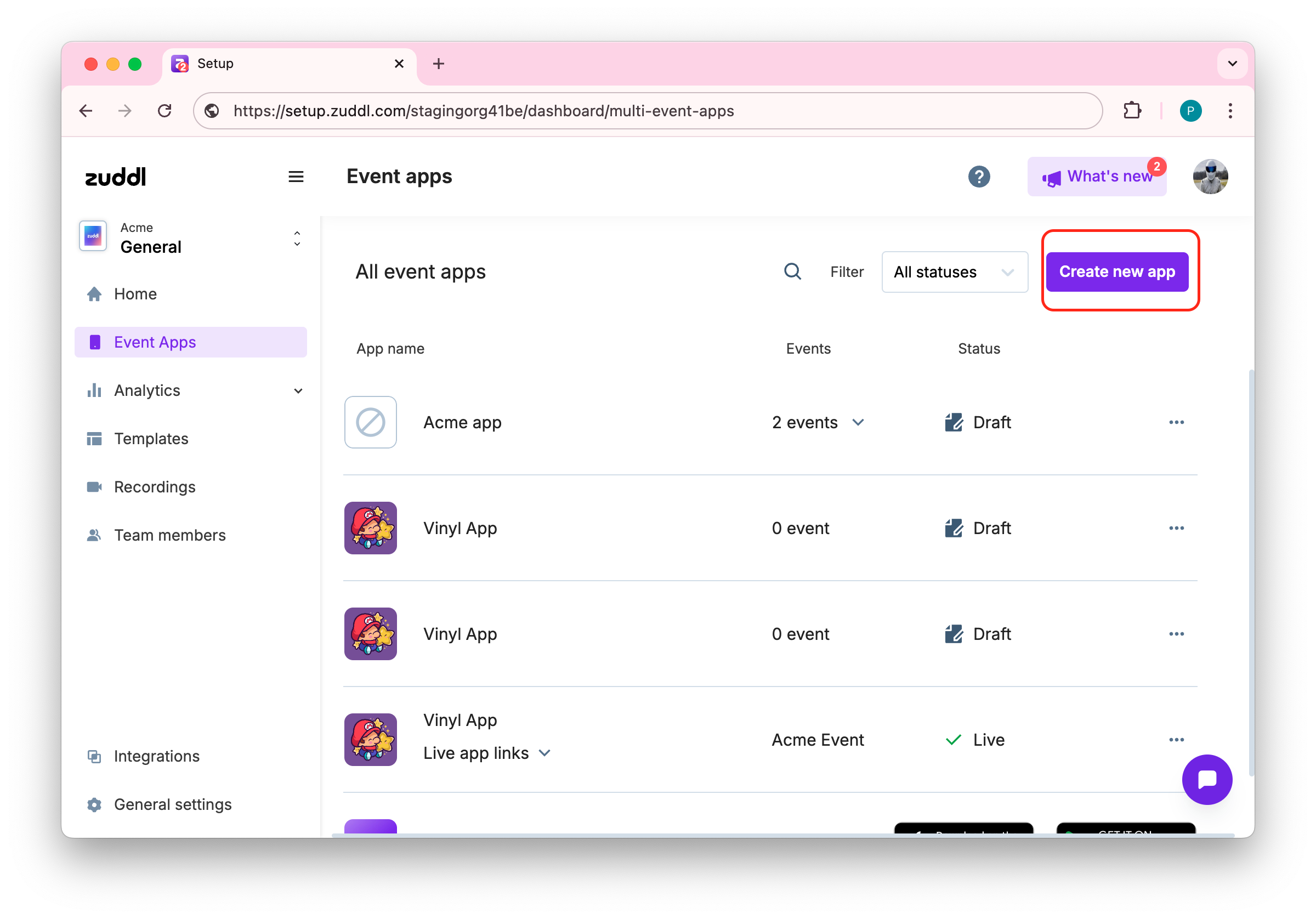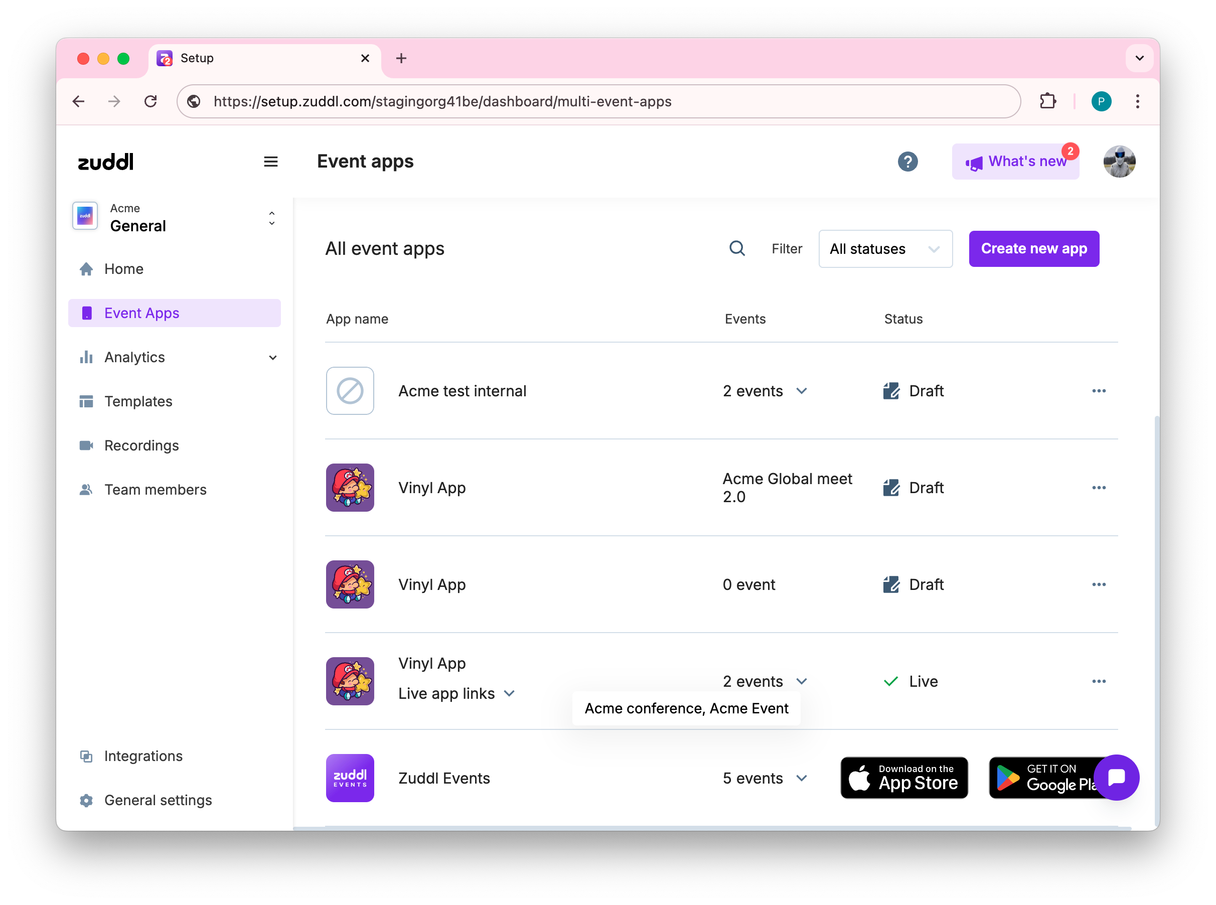 Under the Events column, all the events associated with the app list are shown in the dropdown. You can also delete a draft app. However to delete a Live app or apps awaiting approval, you would require the help of Zuddl Customer Success Manager (CSM).