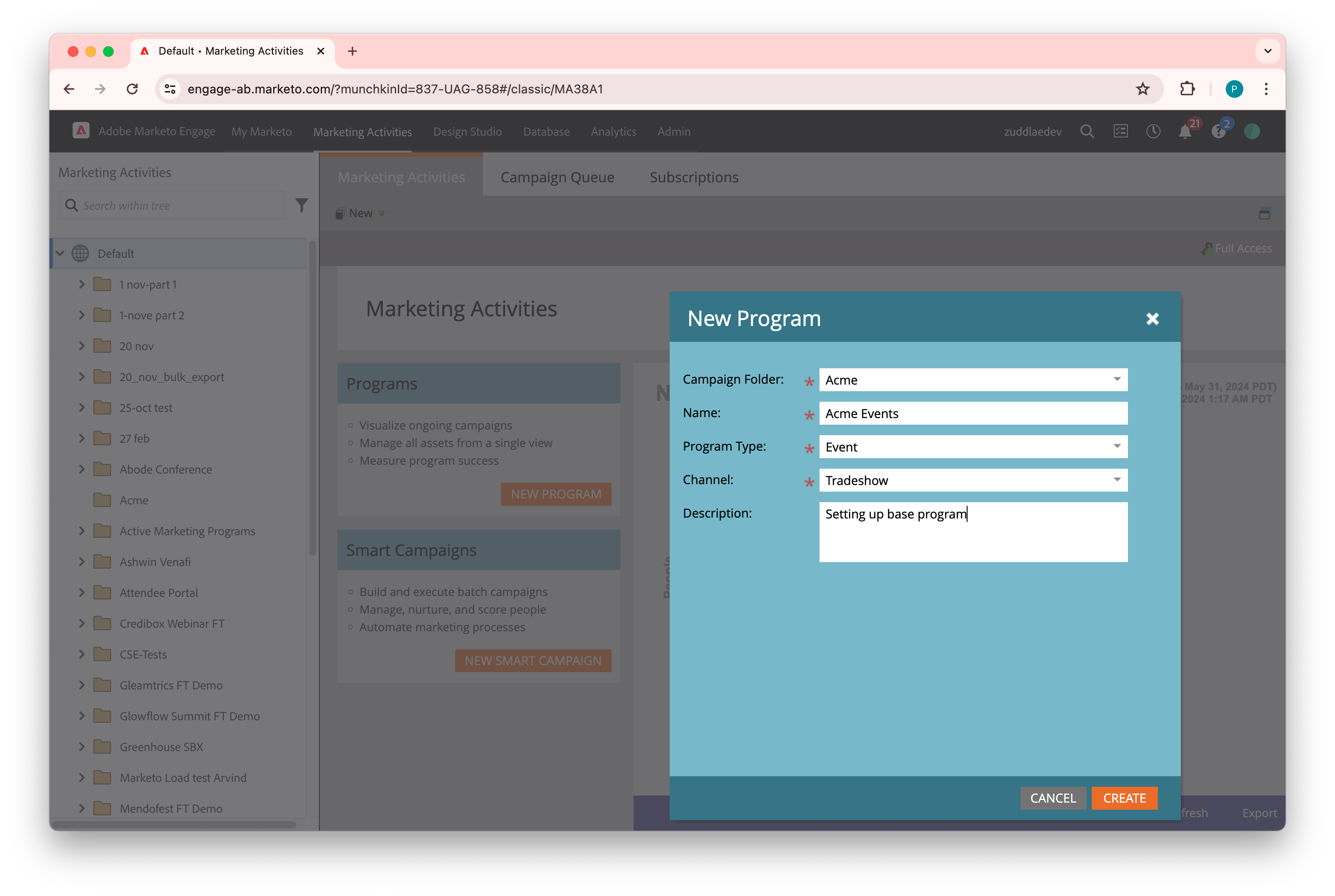 You must create a new program in Marketo that will act as template for your future events. To create a base program,