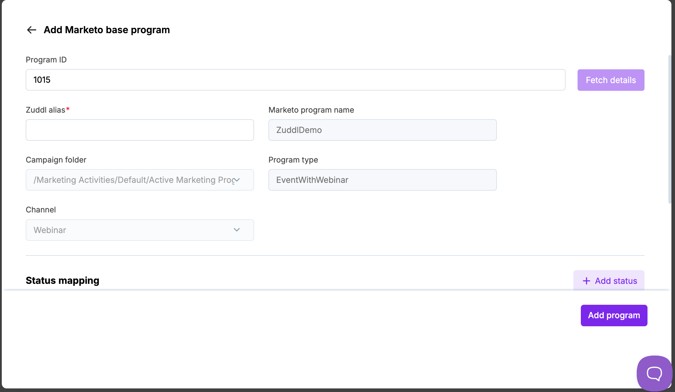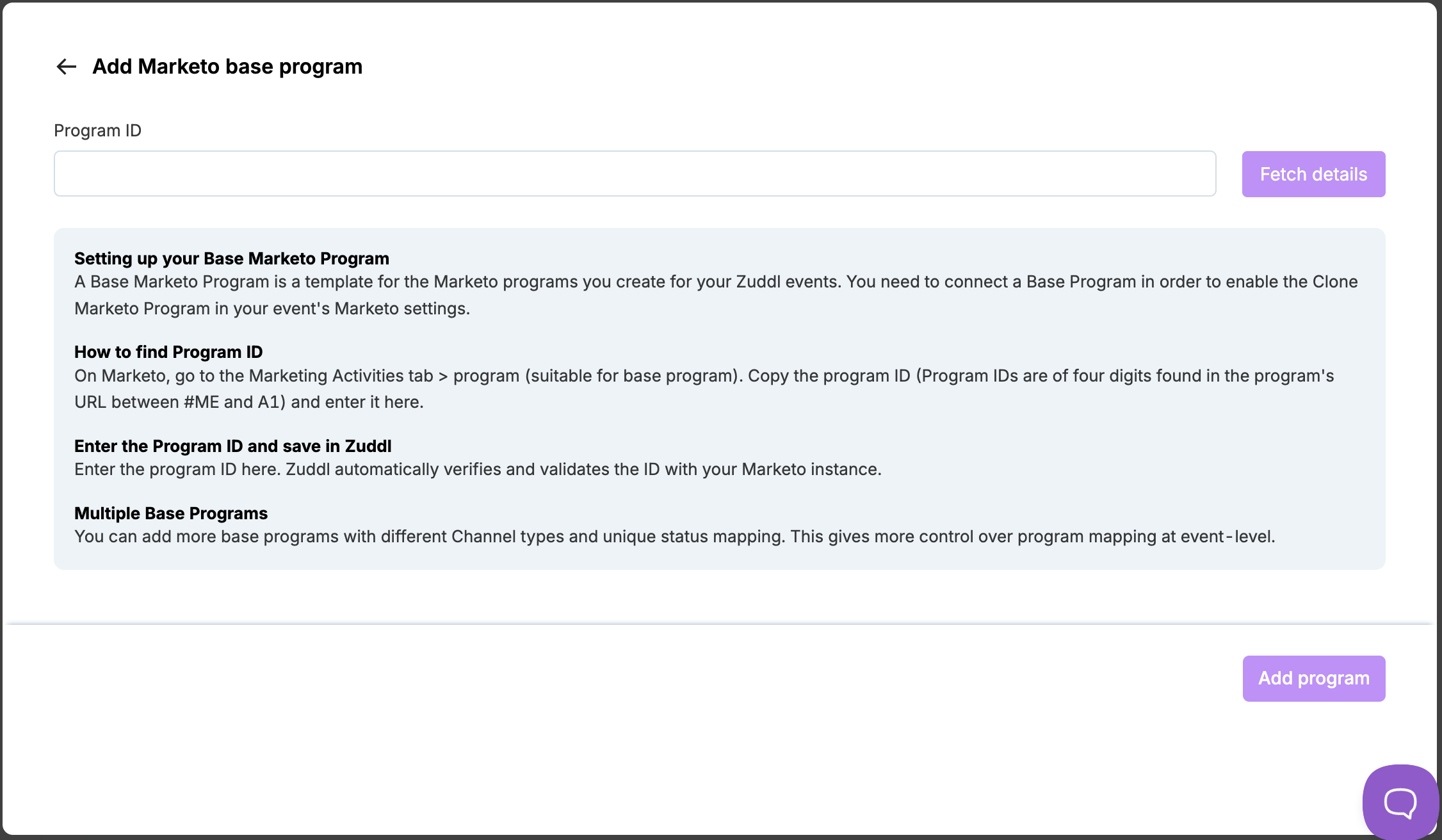Enter the program ID and click Fetch details. Zuddl validates the program ID for your connected Marketo account.