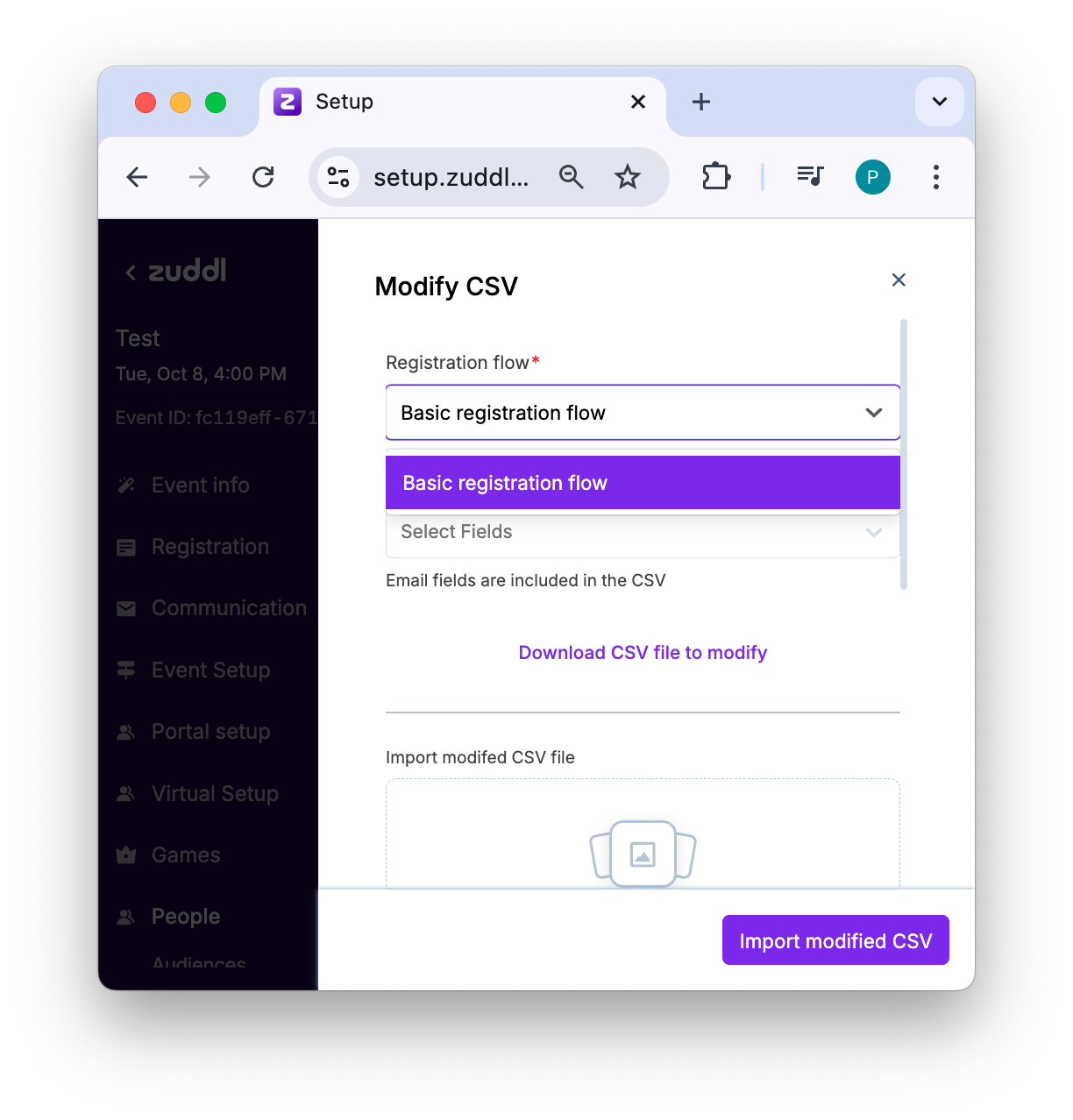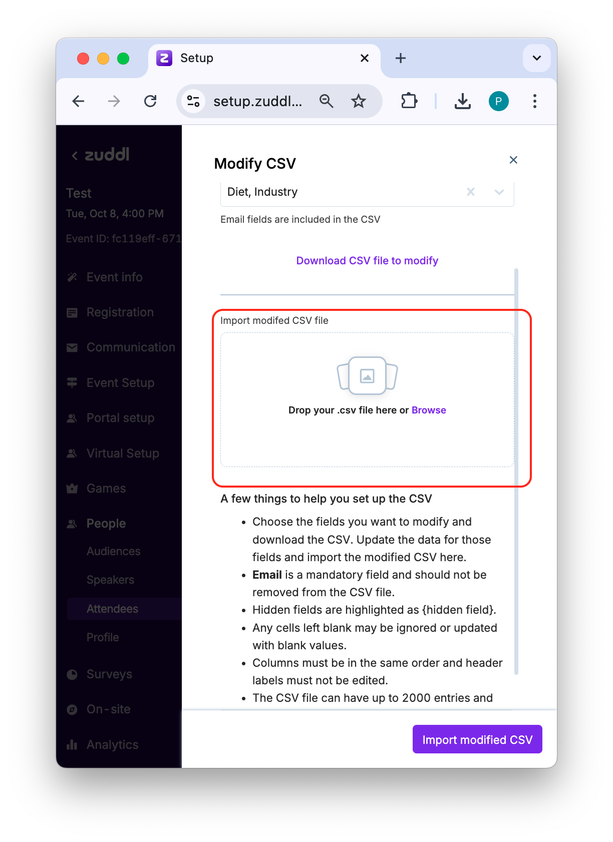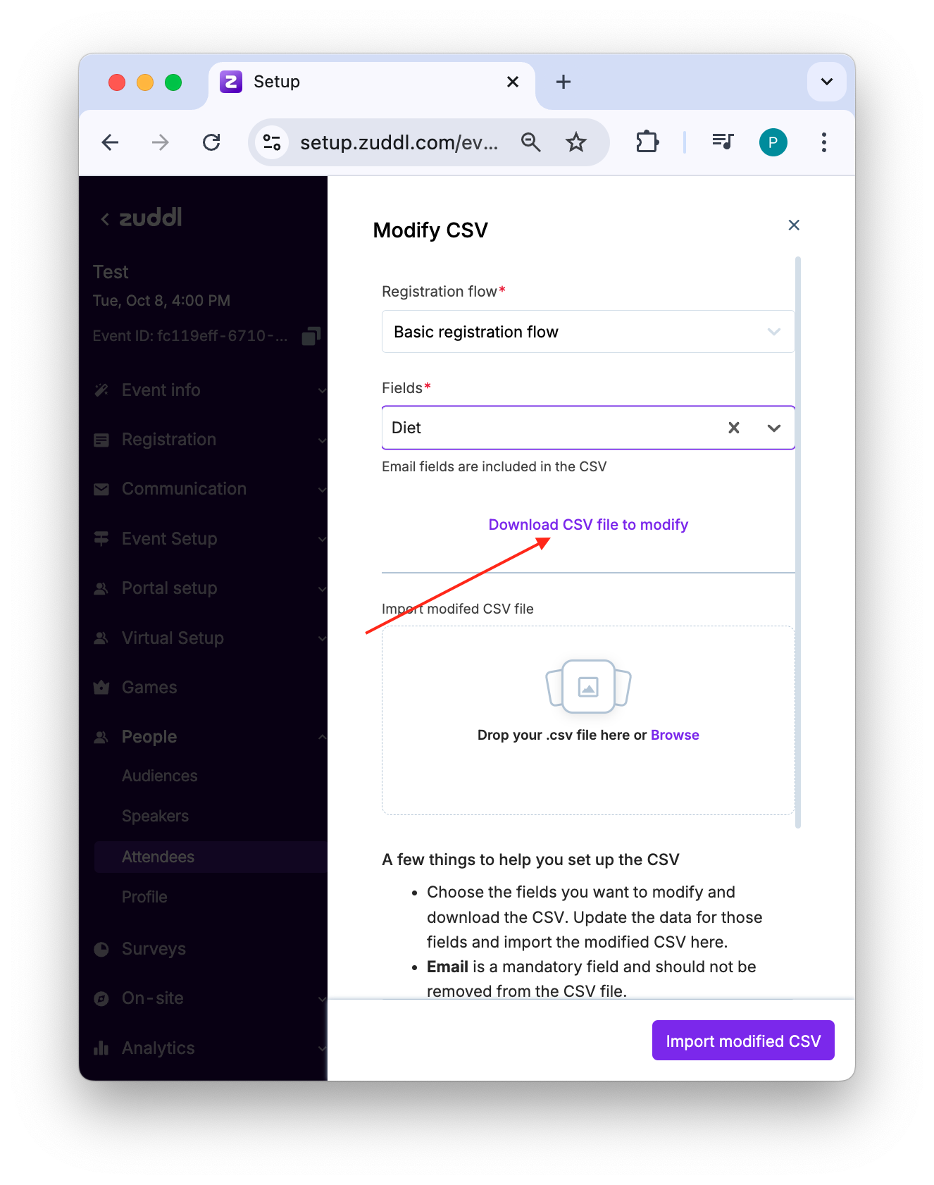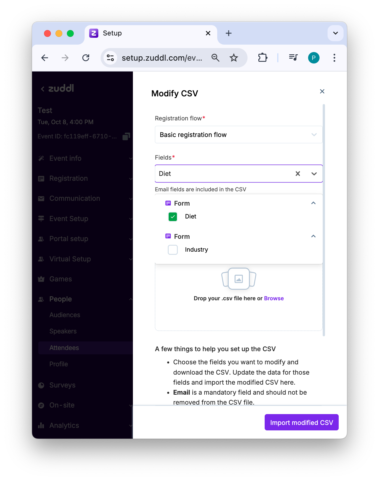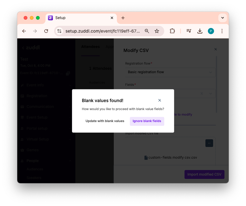 While Zuddl allows you to modify registration values of registration form fields for each attendee, modifying in bulk via CSV lets you easily and quickly make corrections for all attendees together in one go. Modification can be done for all custom form fields, including hidden fields.