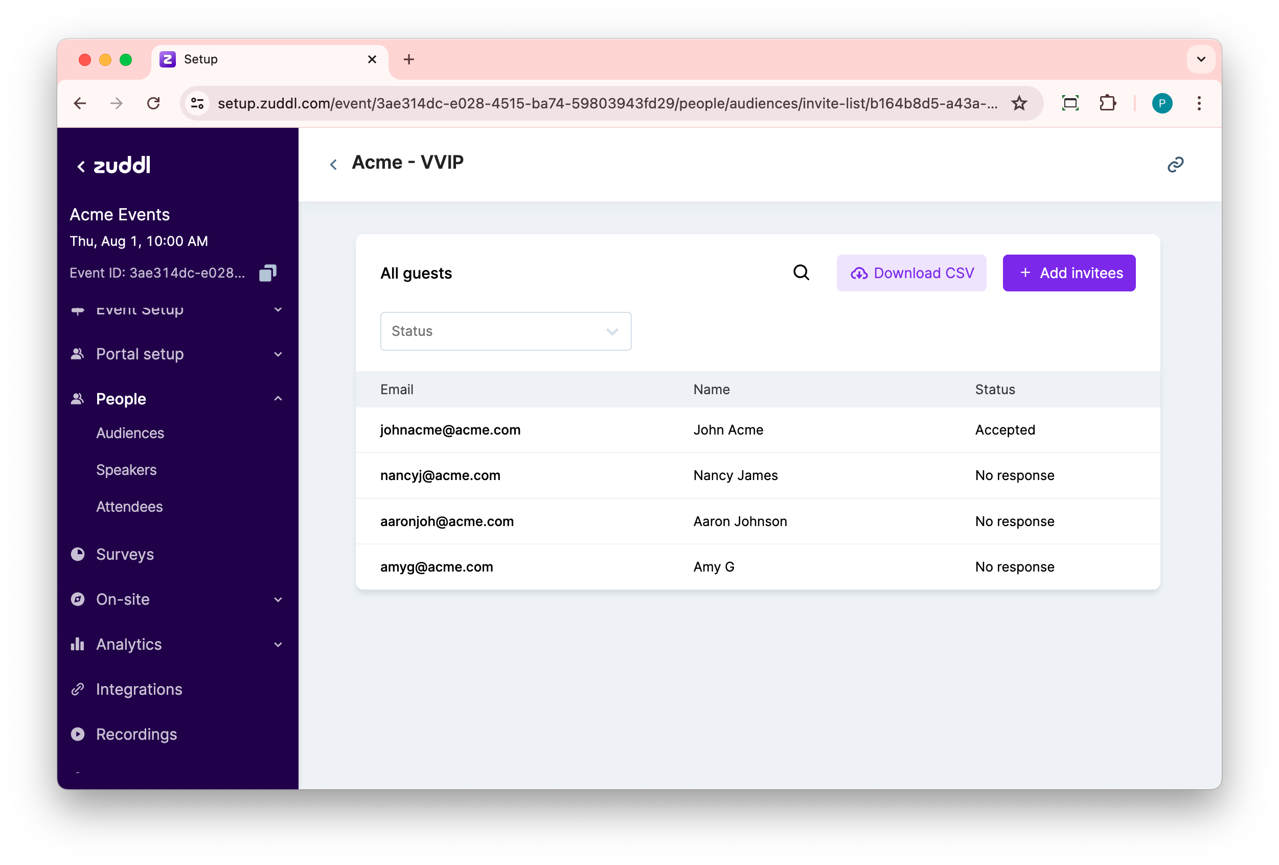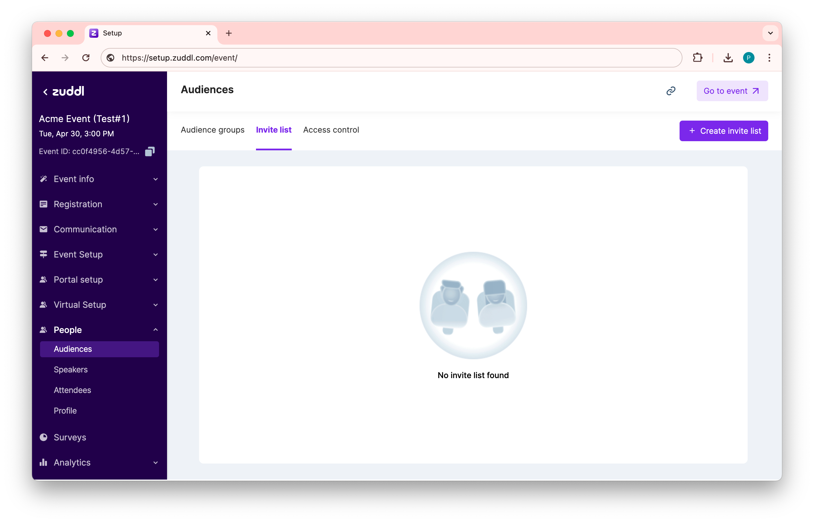 An Invite list is a list of email addresses uploaded to Zuddl in CSV format. Invite lists can be used to invite guests to register for an event. Once people register for the event using the invitation, they are added to the relevant audience groups. An invite list can also be used to send email communication to people who have not registered for an event. For example, you can create an invite list for an event's admin team and send them custom communication, such as event invites, special instructions, and so on.