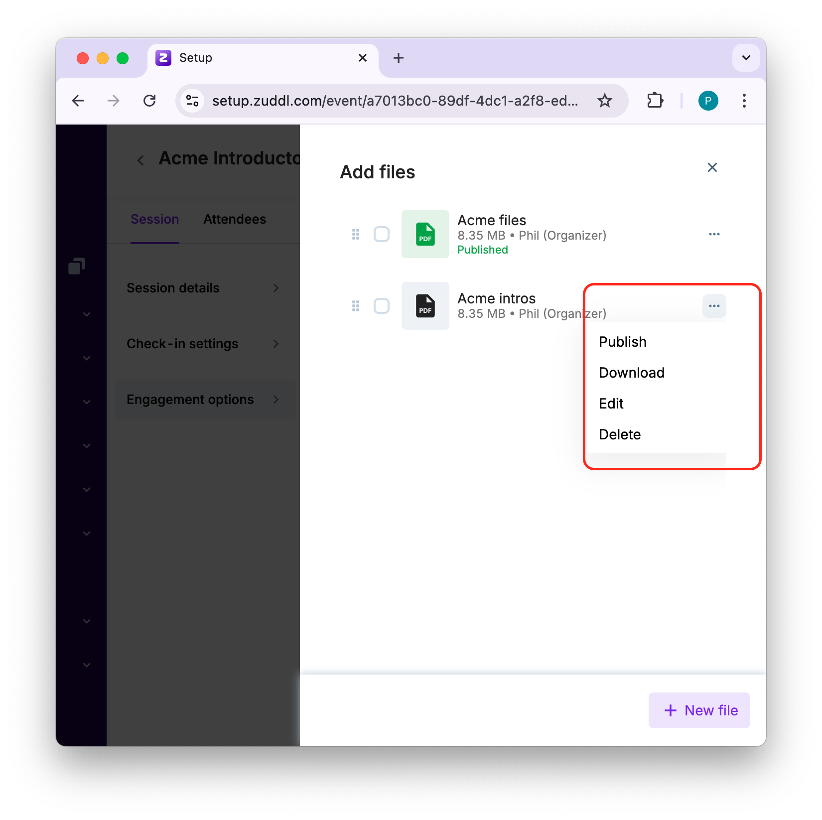 Publish/Unpublish: Publish or unpublish a file for attendees.