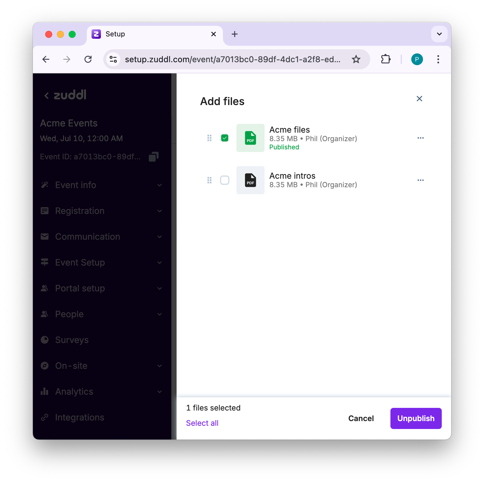 Once added, you can choose to publish files to attendees by selecting them. To publish files