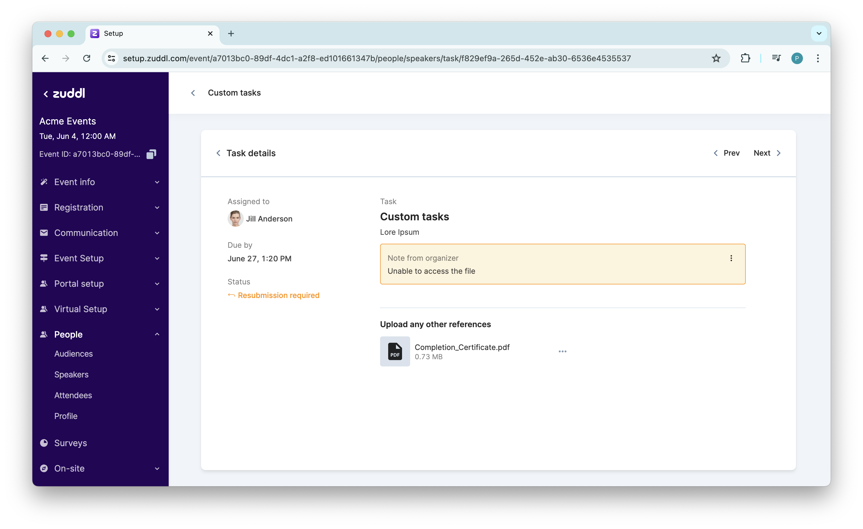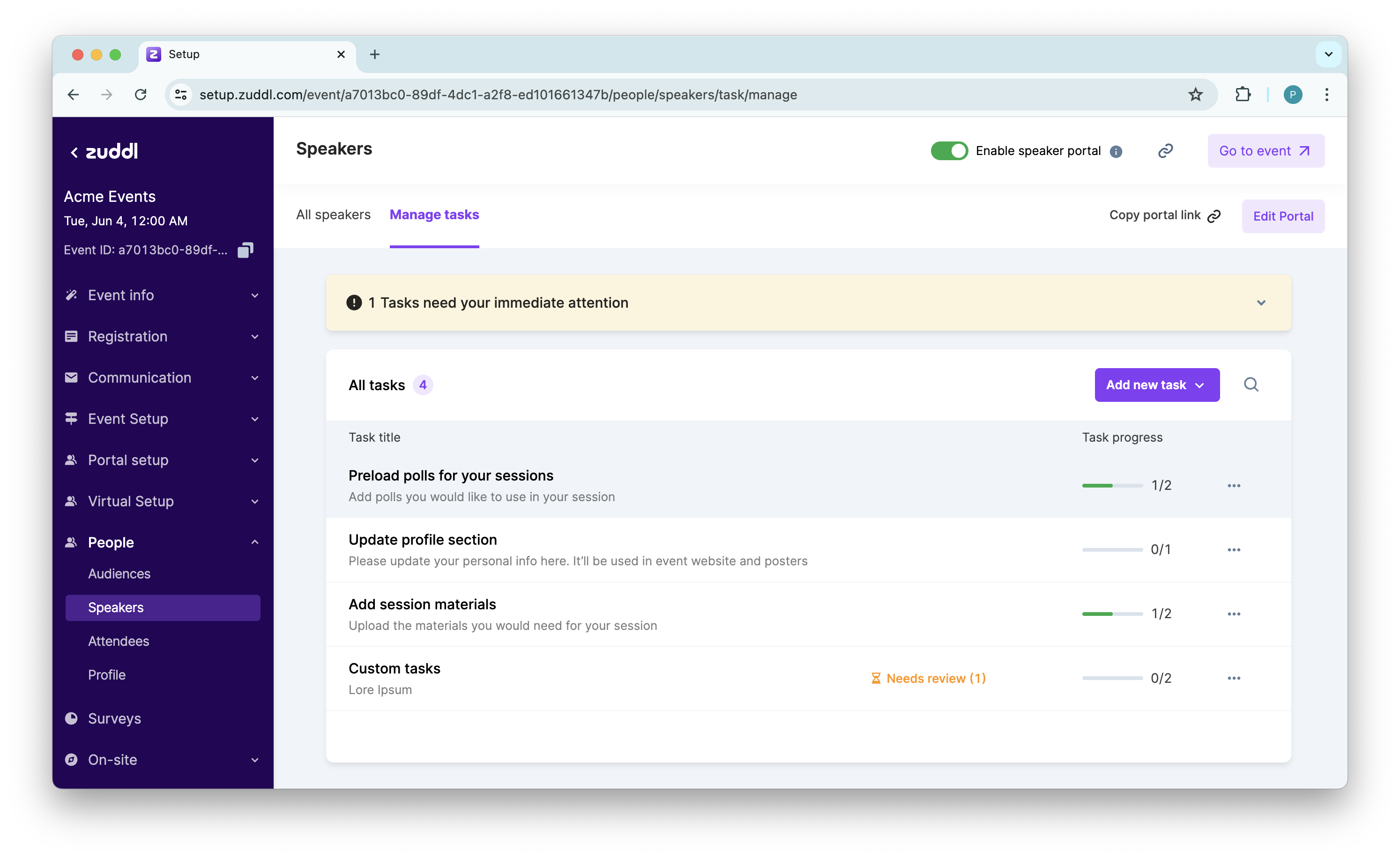 After the speaker submits a task, it shows on the dashboard as ‘Needs review’. Additionally, a banner alerts organizer of the review request as shown below: