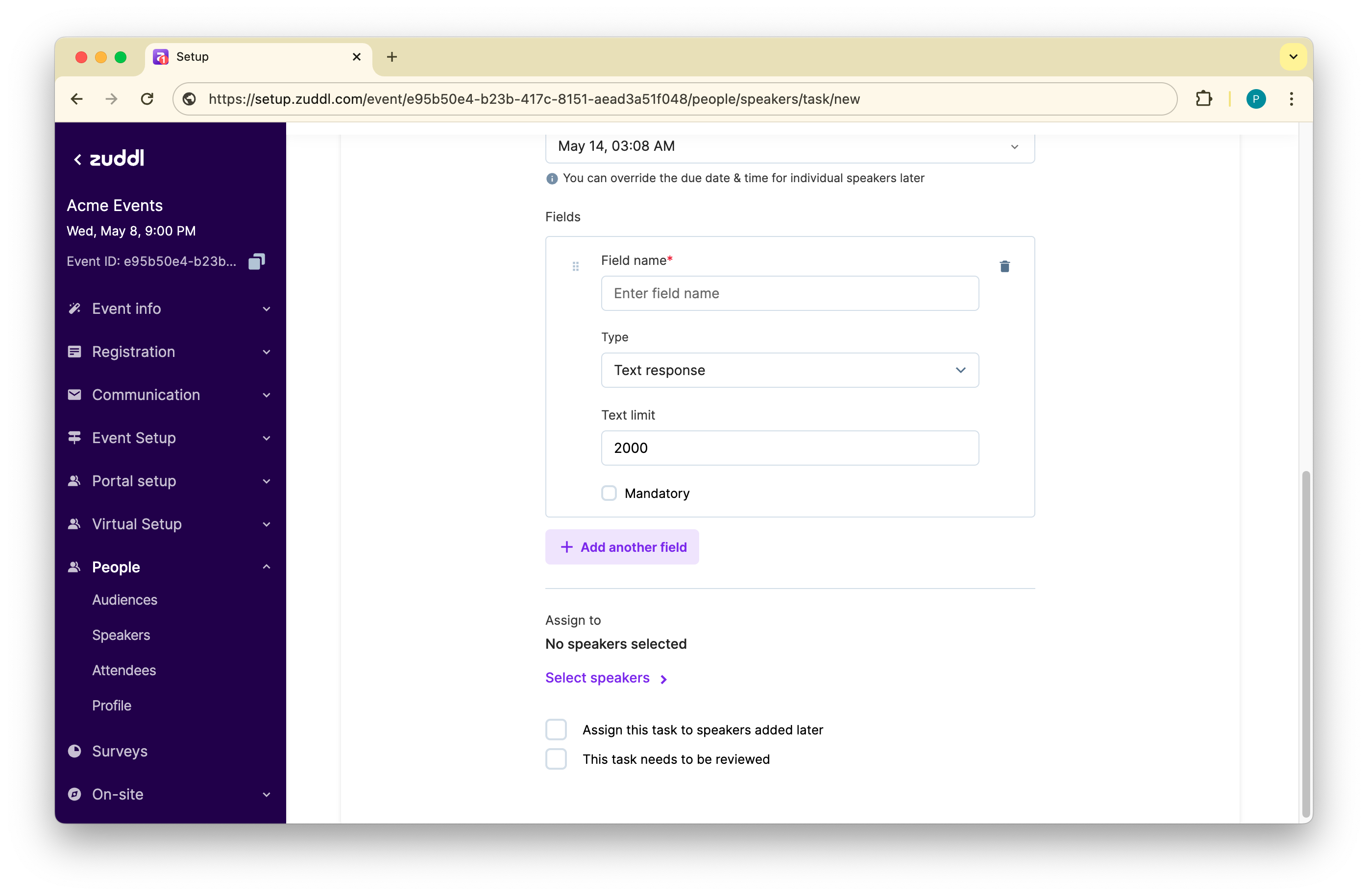 - Optional. Select the Mandatory checkbox if this is a mandatory task field for the speaker. If mandatory, the task doesn't get completed until the field is responded to.