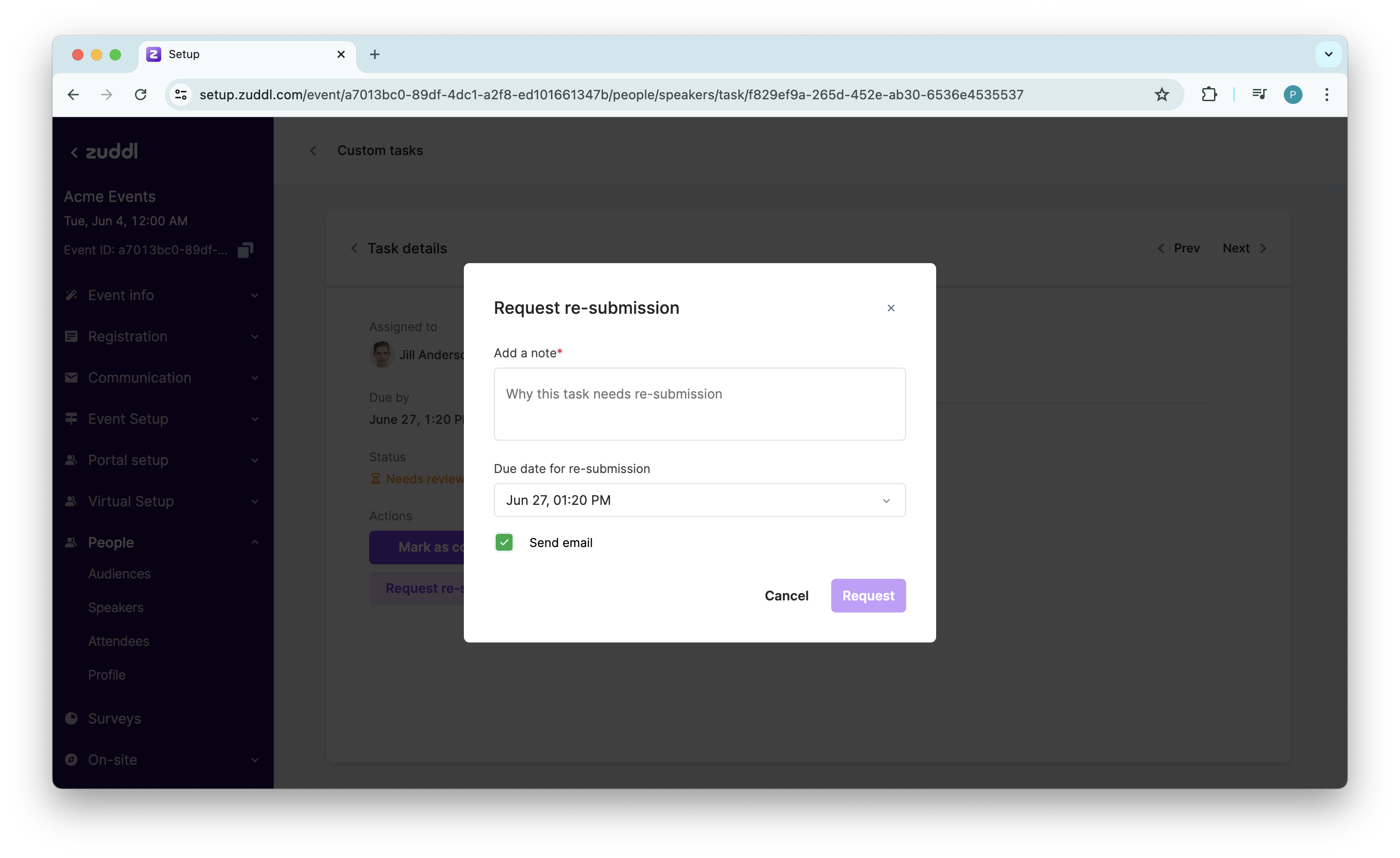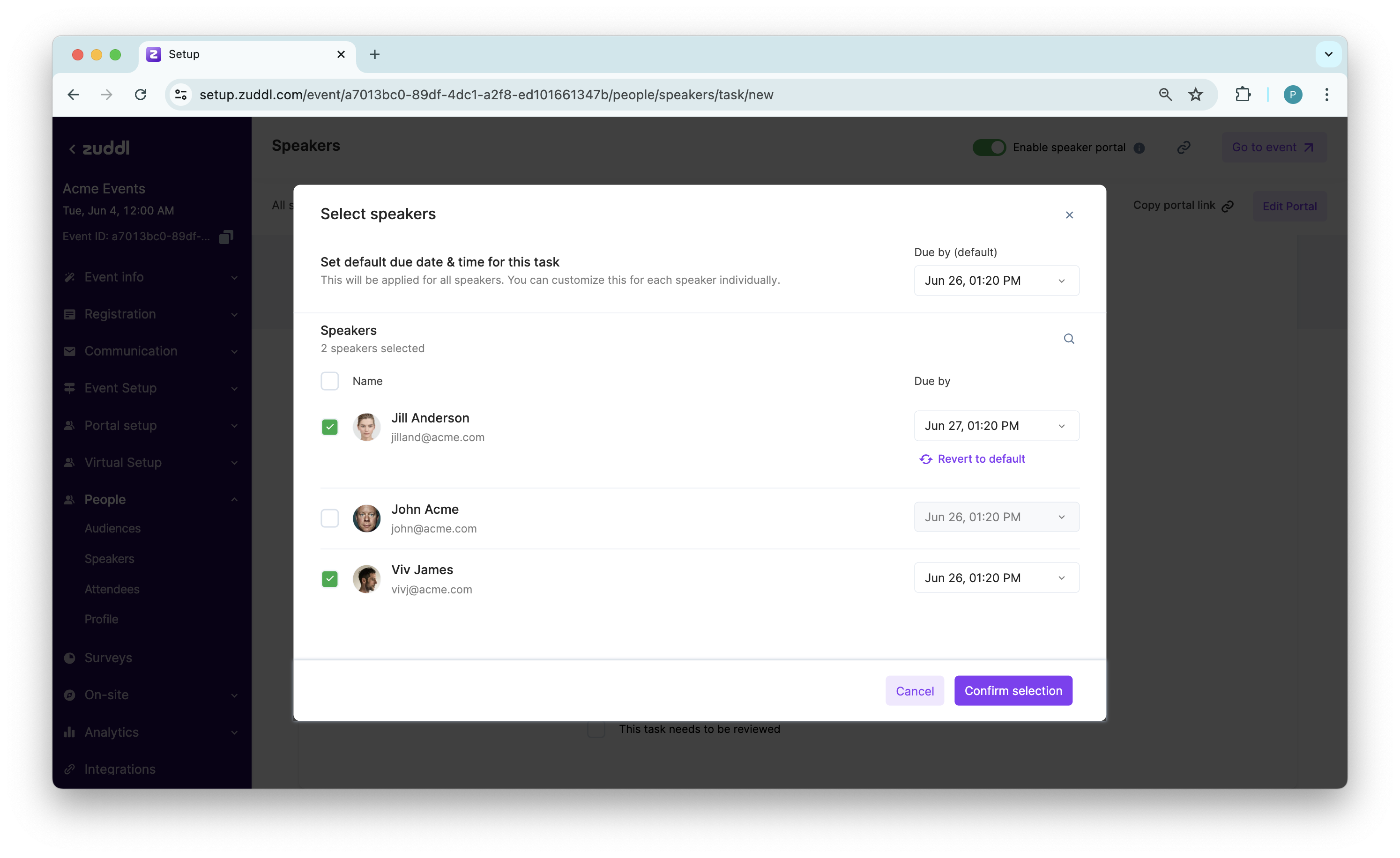 You can go with the default Due date for all speakers or set a custom due date for each speaker. You can also Reset to default from a custom date. - Click Confirm selection.