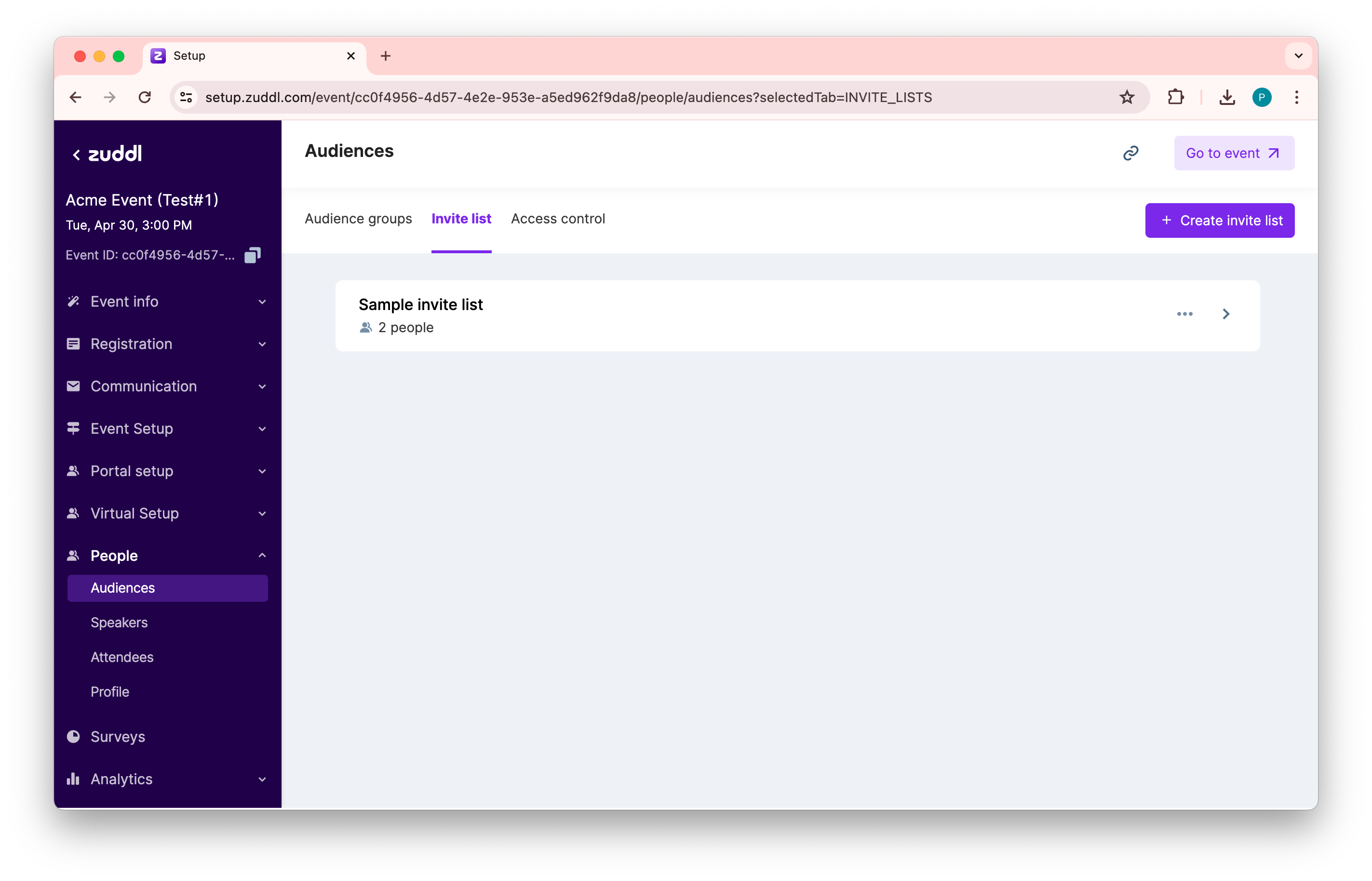 An Invite list is a list of email addresses uploaded to Zuddl in CSV format. Invite lists can be used to invite guests to register for an event. Once people register for the event using the invitation, they are added to the relevant audience groups. An invite list can also be used to send email communication to people who have not registered for an event. For example, you can create an invite list for an event's admin team and send them custom communication, such as event invites, special instructions, and so on.