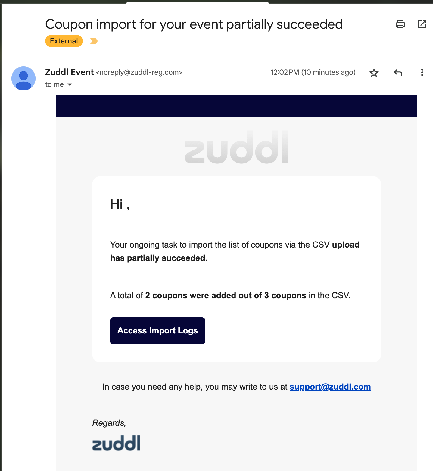 For instance, if 2 out of 3 coupon details were correctly entered in the CSV file, the correct coupons details get uploaded. Zuddl sends you an upload status email wherein you can view the import logs by clicking the Access Import Logs button.