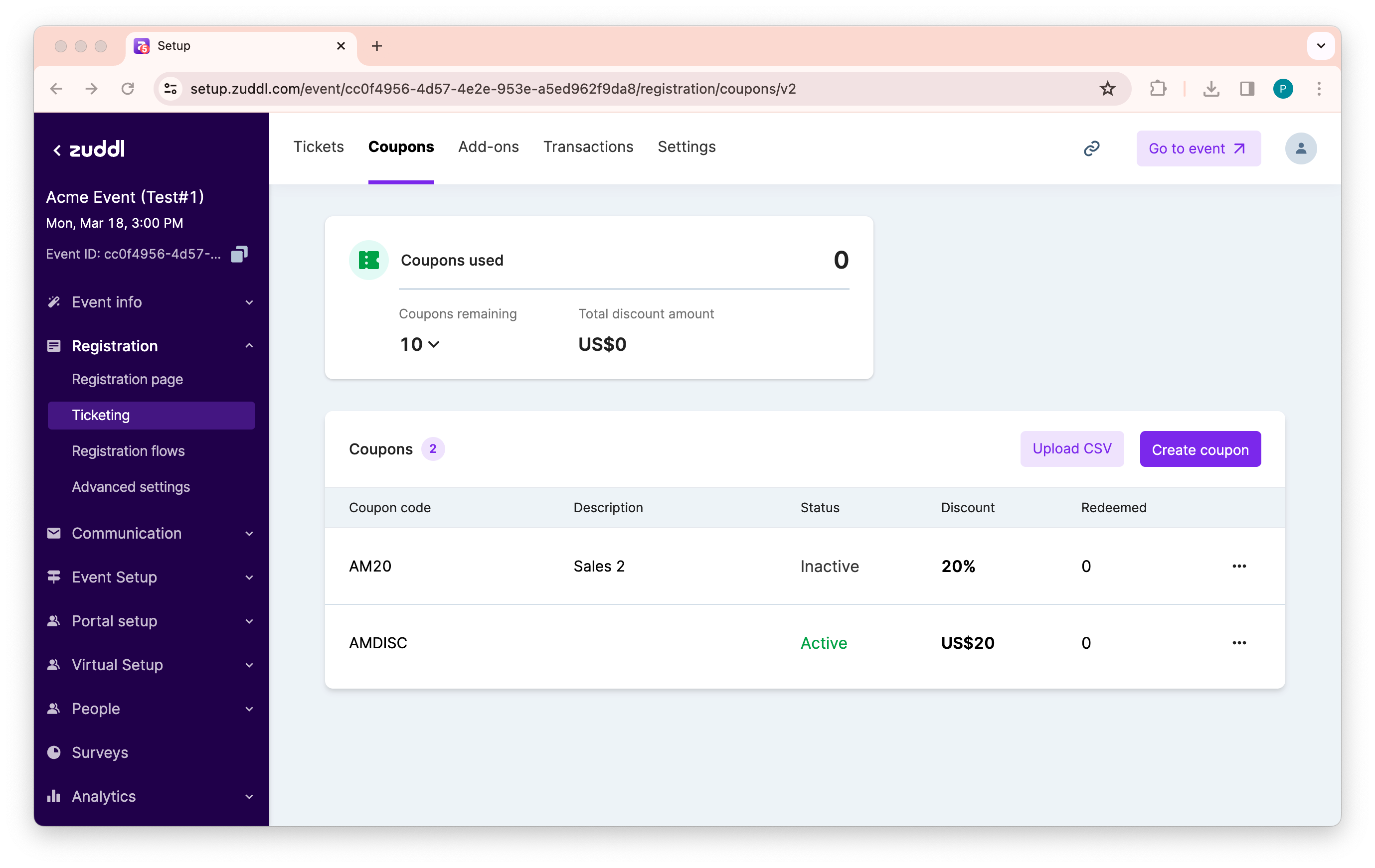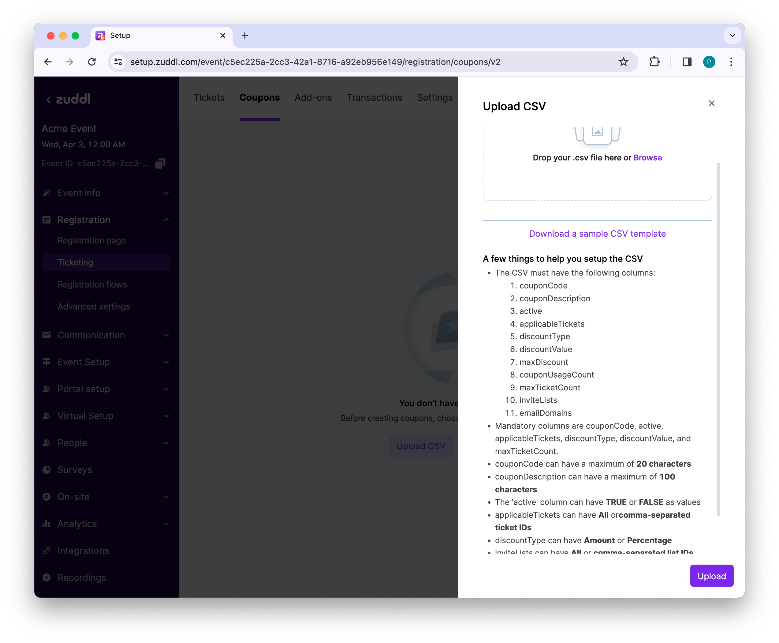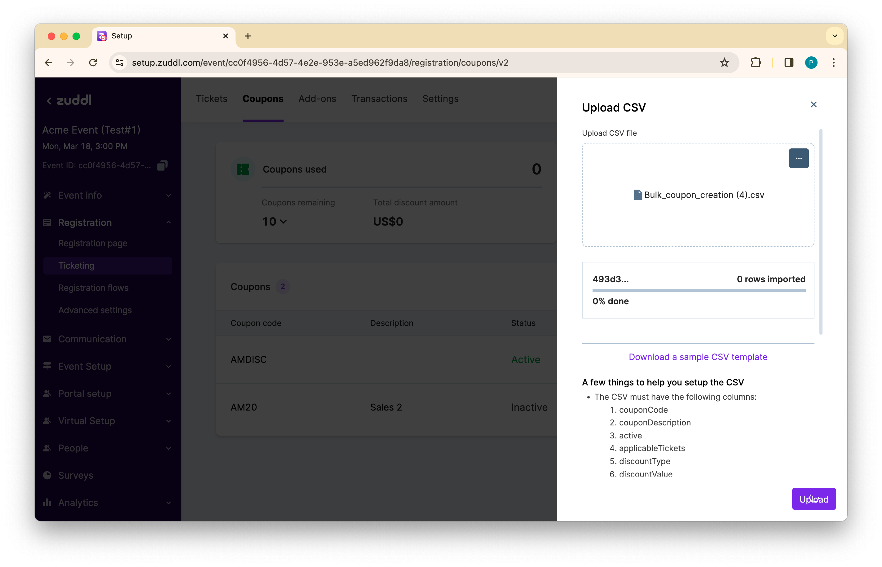 If you have a big list of coupons, you can upload a CSV file that contains all the required coupon information on Zuddl instead of creating individual coupons. Zuddl uses this file to create coupons on your dashboard.