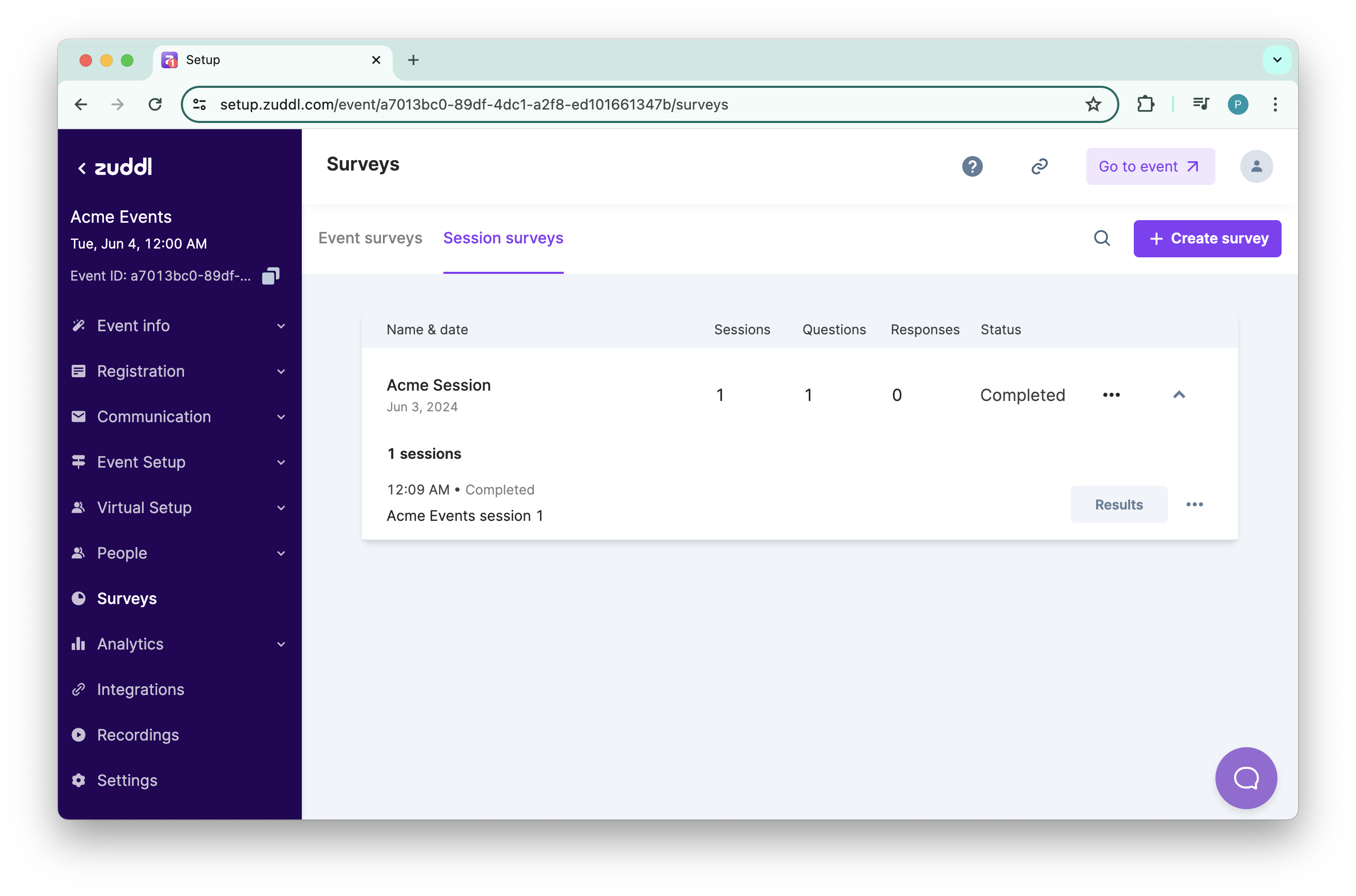 By the creation of a survey, two tabs appear: Event surveys and Session surveys. Surveys appear in their respective tabs based on type of session you create.