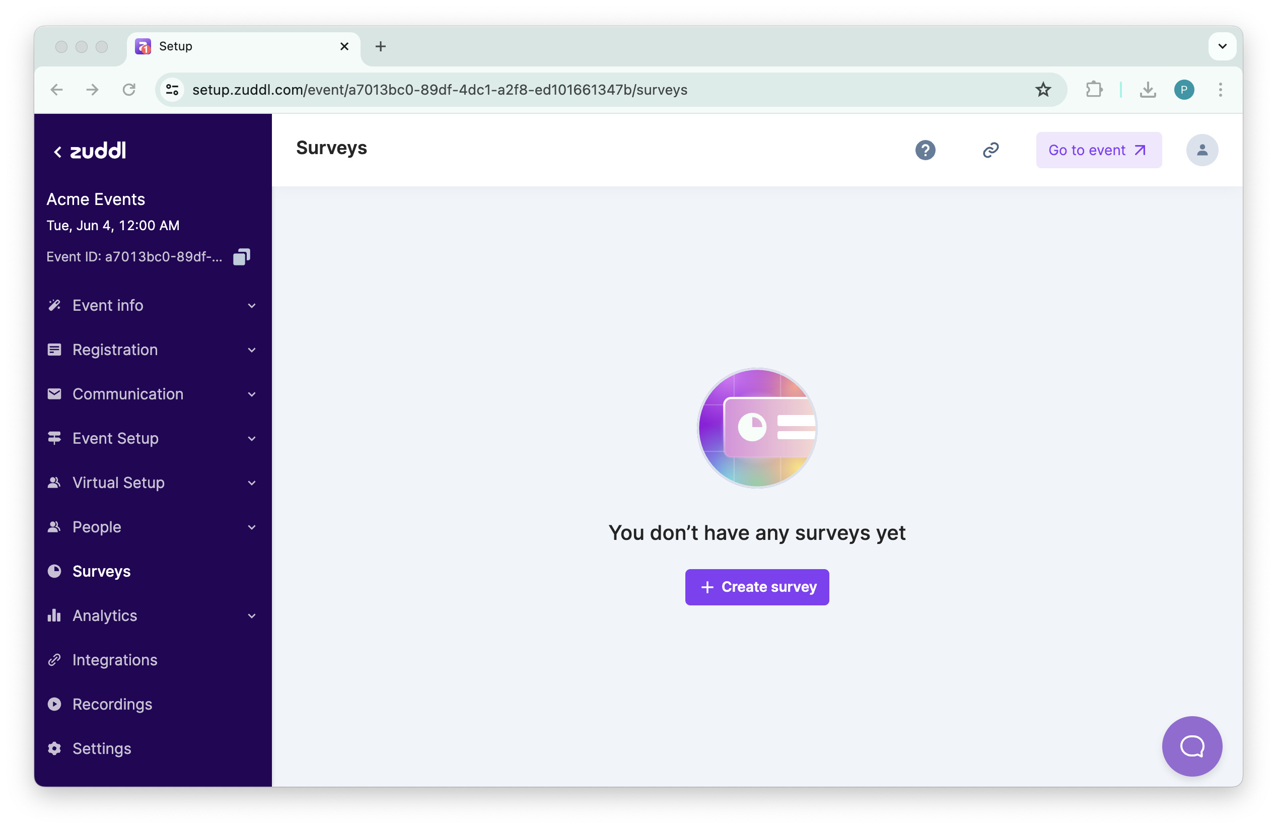 Zuddl enables you to create surveys and gather valuable insights from the attendees. Surveys are used to assess the effectiveness of an event, and they can help improve future events. Event surveys typically include a variety of questions designed to evaluate different aspects of an event.