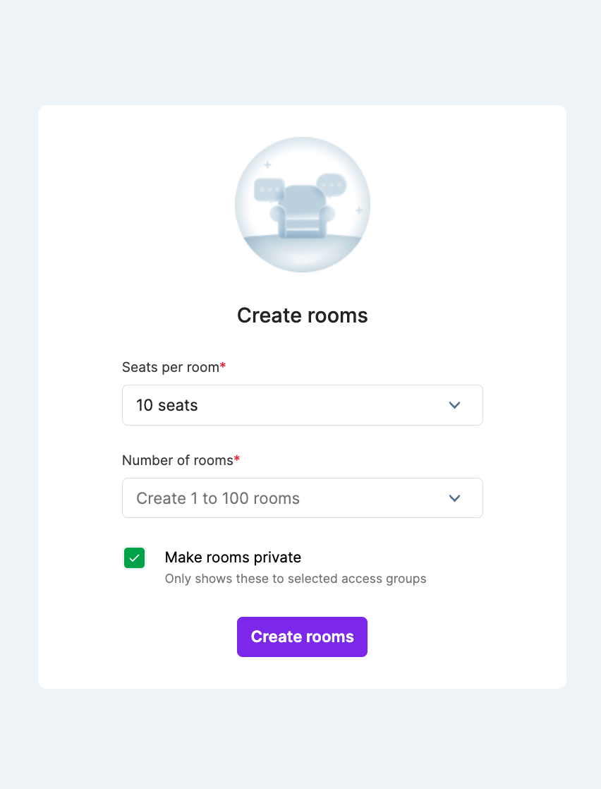 - Select the Seats per room from 2, 4, 6, 8, or 10 seats. If you want more than 10 seats, select Custom seats with a maximum of 200 seats.