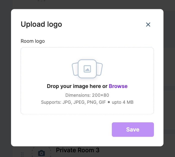 Upload a logo for your room by clicking on the room icon. The Logo appears on the room card and also inside the room. The recommended format is a 200*80 pixel in a .png, jpg, jpeg, gif file. Browse or drag the logo file (jpg, jpeg, png, gif; upto 4Mb) from your device and click Save.