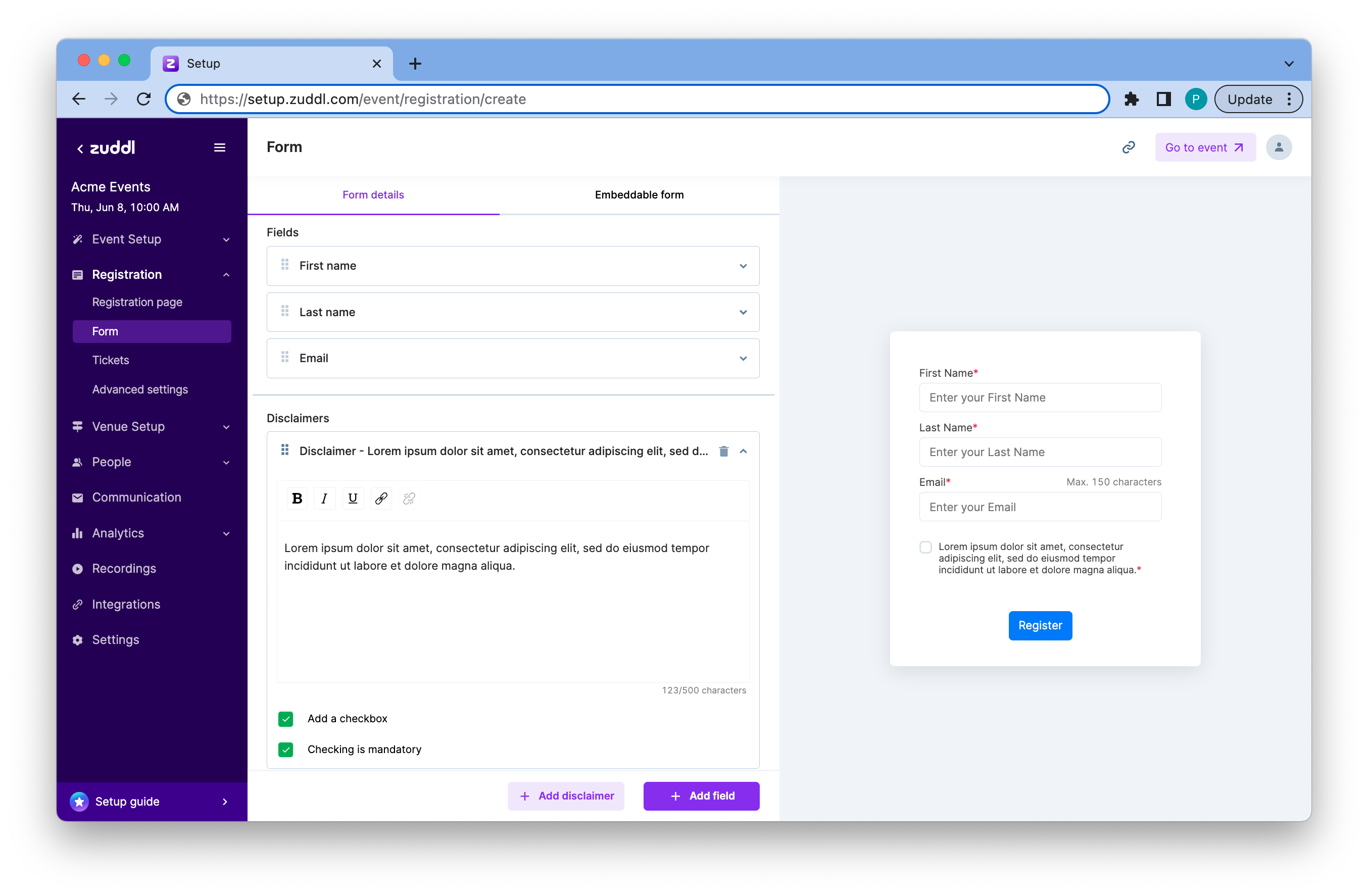 You can add new fields to your registration form as per your event requirements. A two-column page layout lets you add new fields on left panel and preview the form with the new fields in real-time on the right.