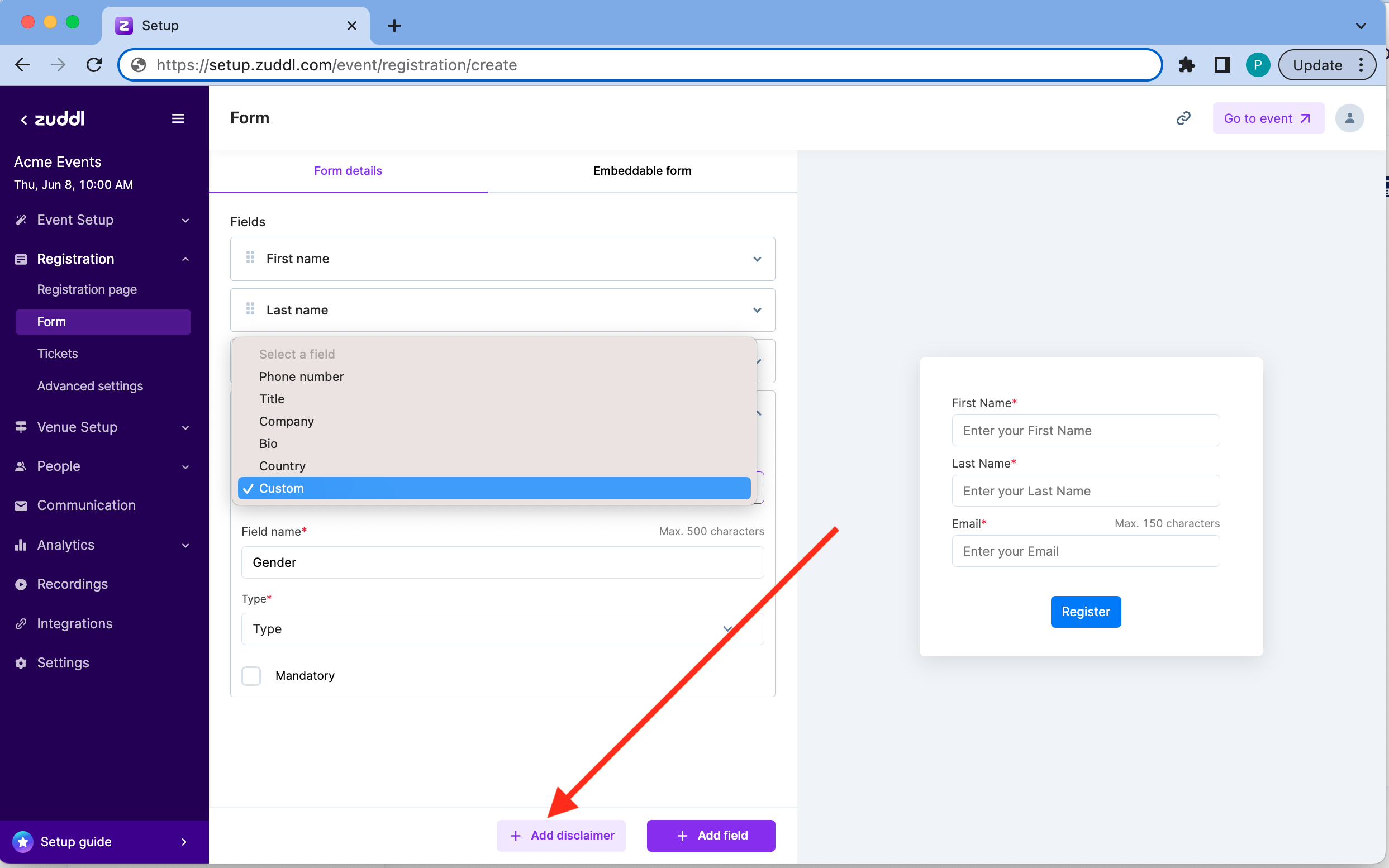 The registration page fields can be customized according to the event needs. Follow these instructions to edit them: