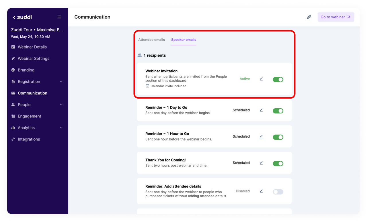 The email templates available for speakers have fewer options than for attendees, since speakers don't need to register for the webinar.