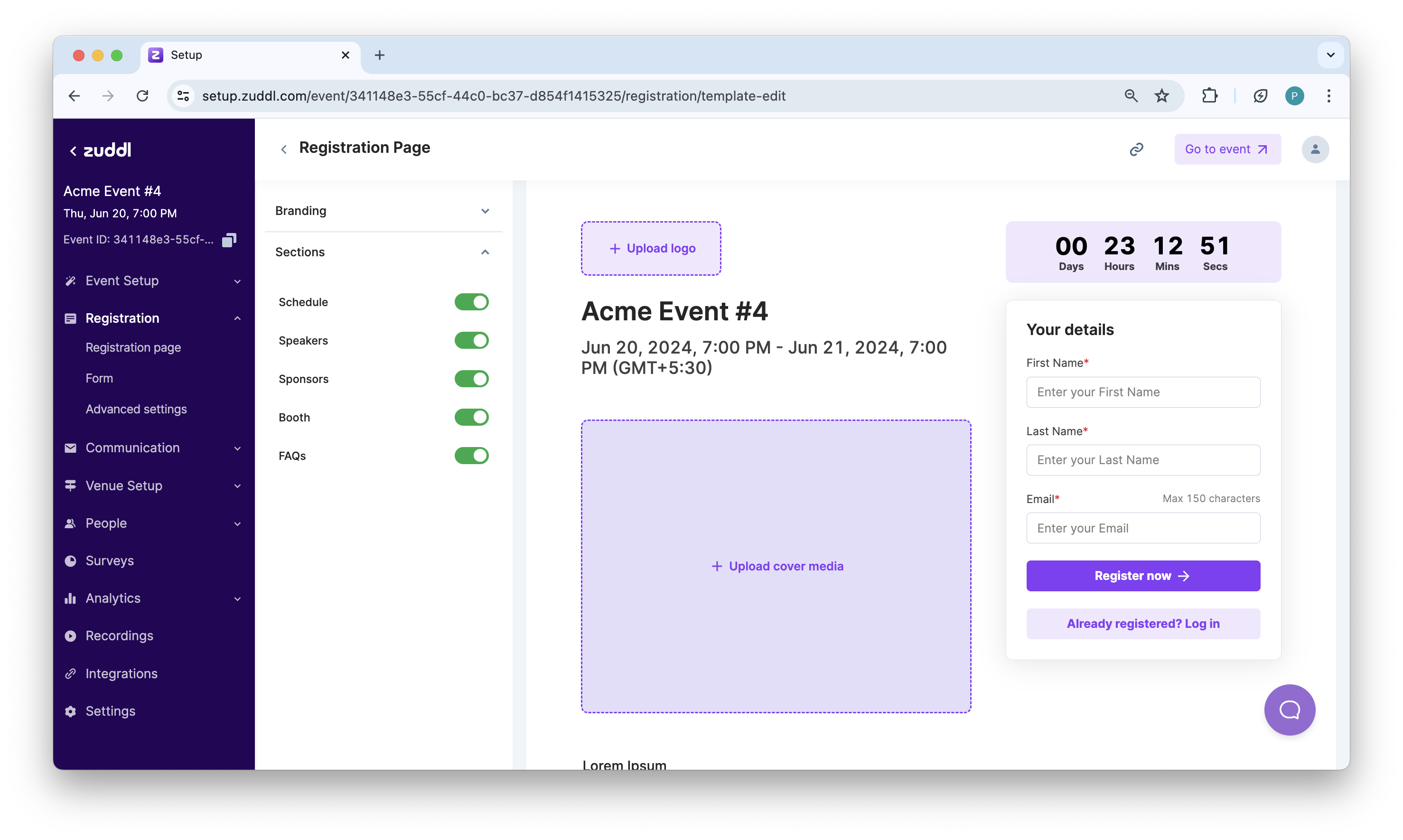 Click Sections to see the different information sections of the registration page. Toggle off any sections that you don’t want to show.