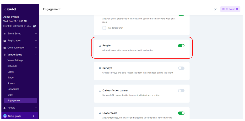 If the People option is toggled on, attendees can search for the invitee from the People tab under Events from any venue and start a private conversation.