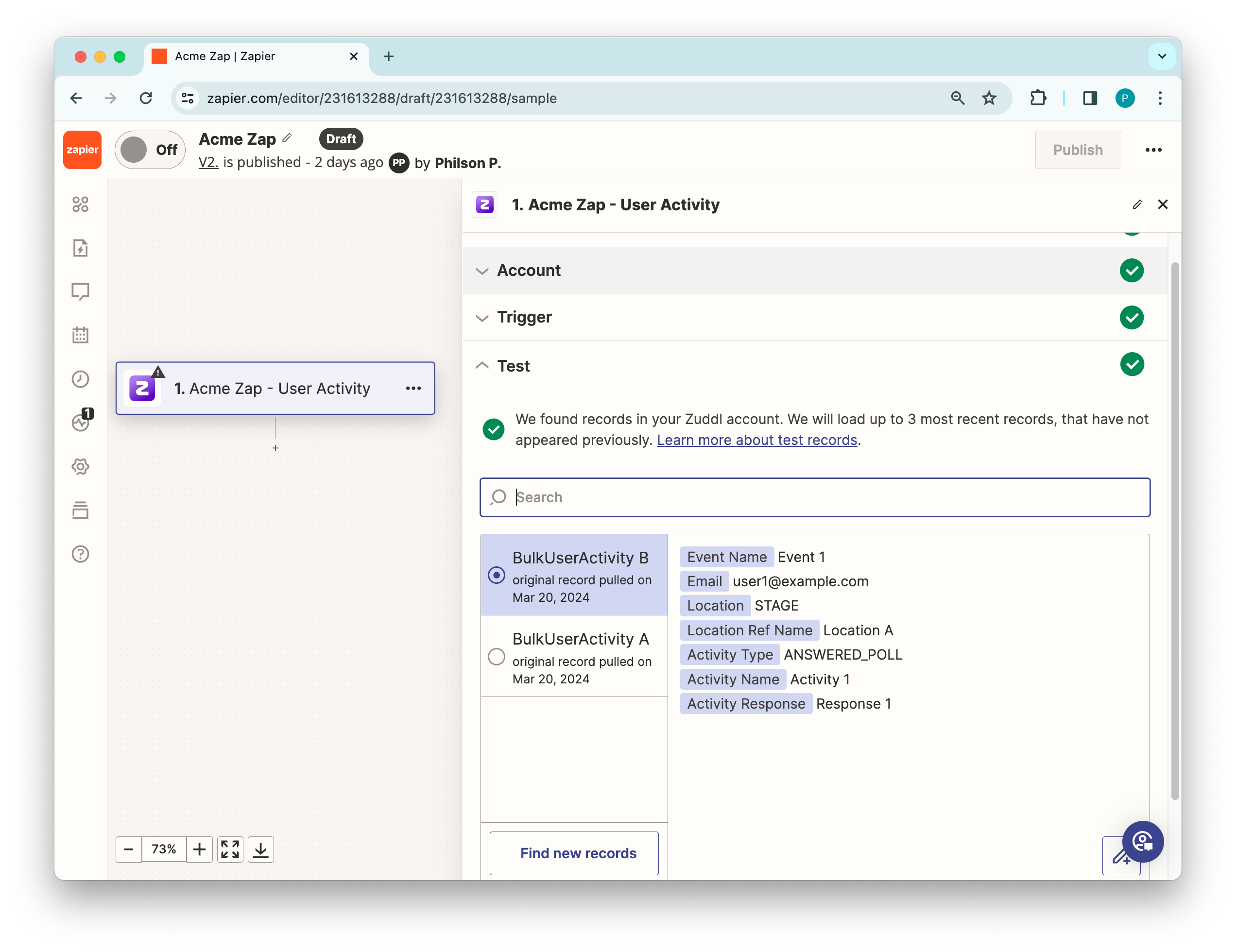 Click on the Zap runs icon on the side navigation to view the data logs: