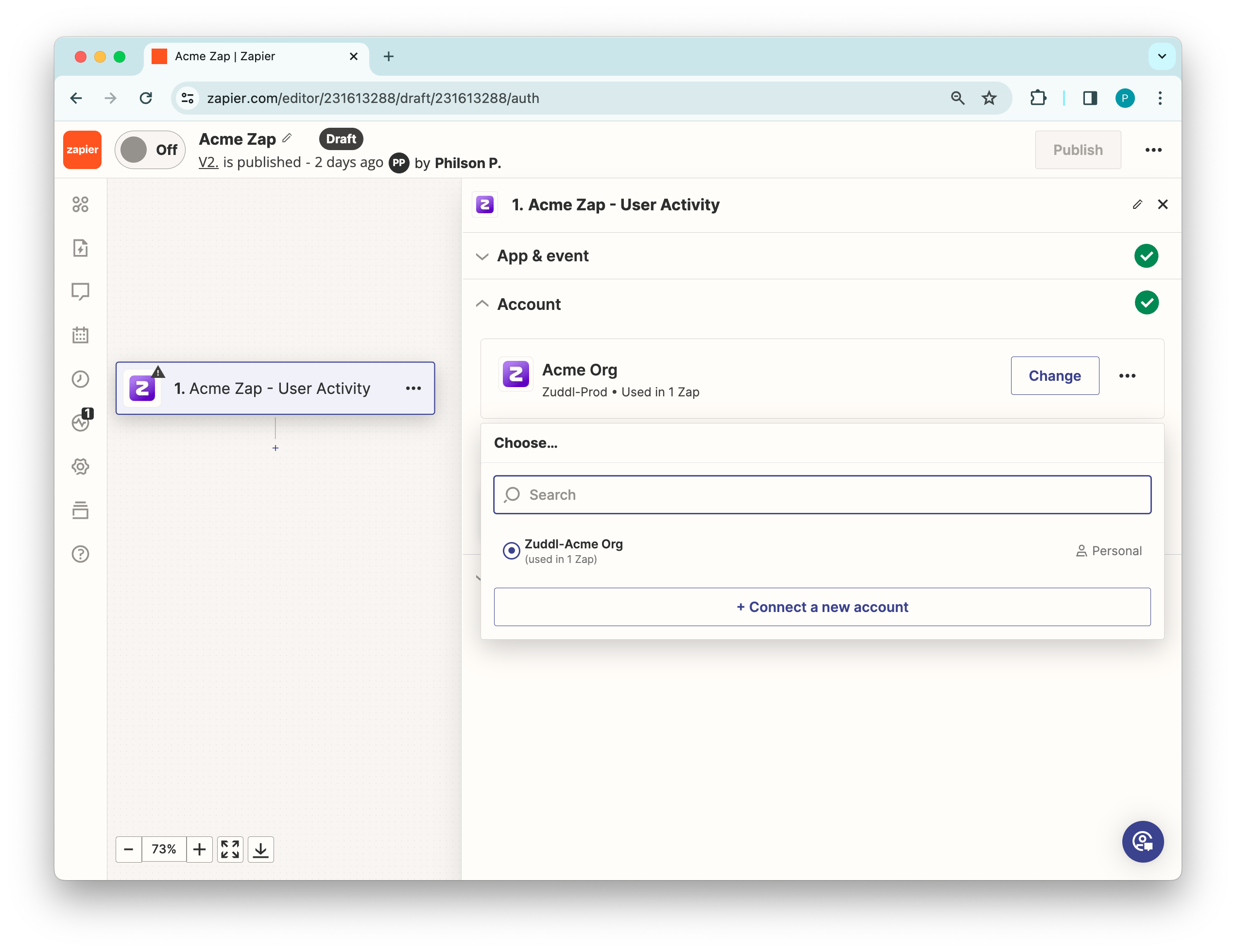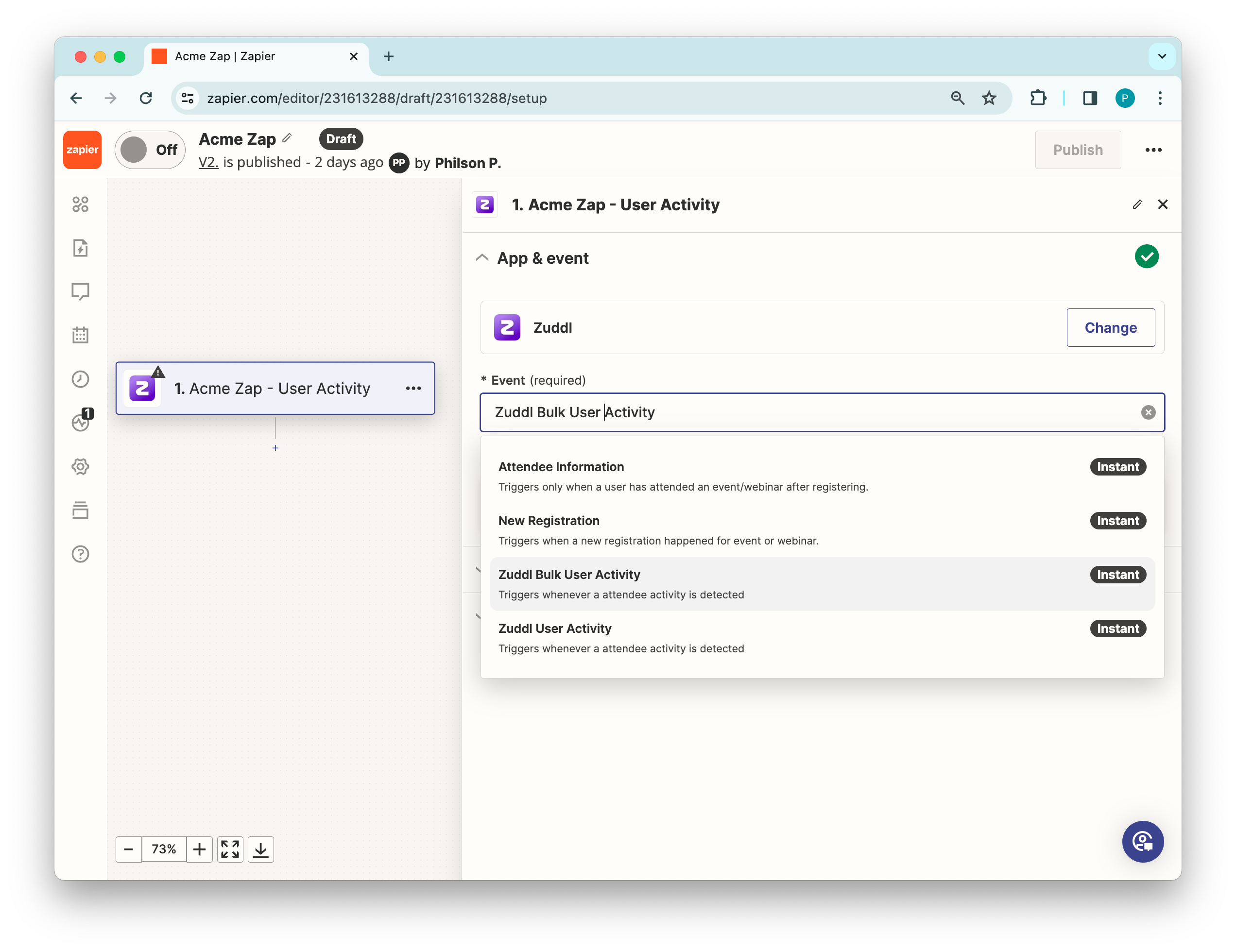 On the Change trigger screen, search for the Zuddl app and click on the latest version of the Zuddl app.