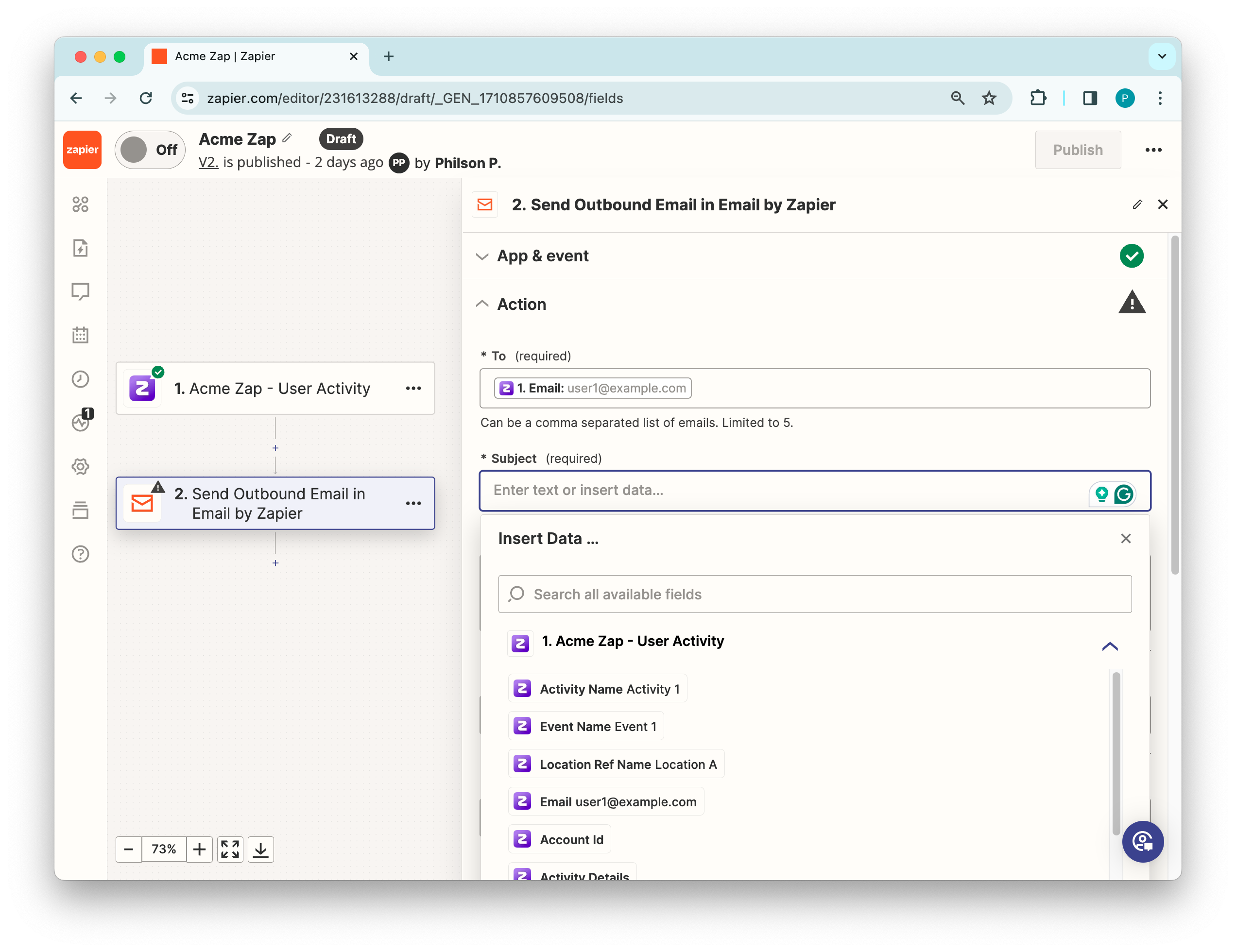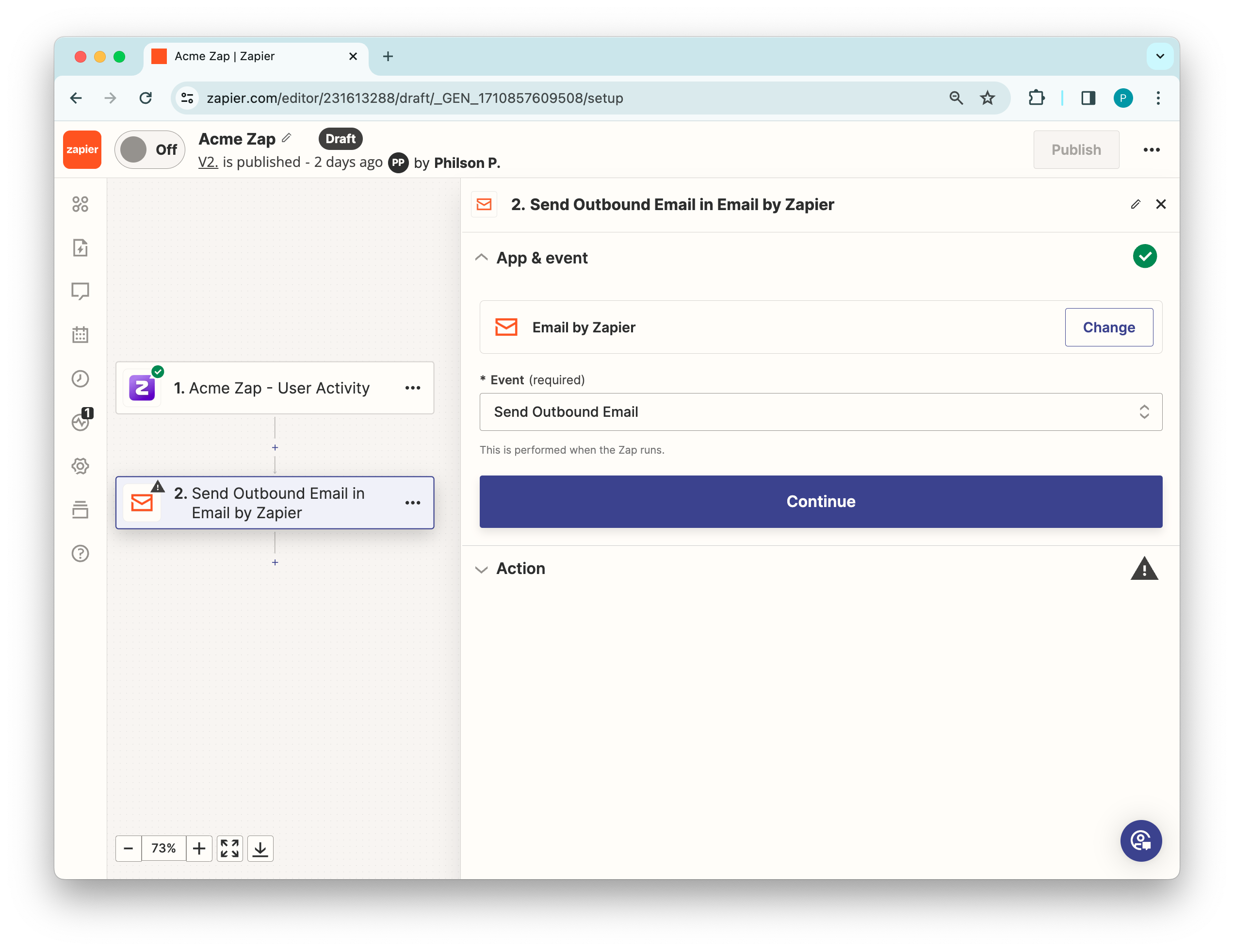 You can now add any action, for example, let's take the action ‘Outbound Email by Zapier’.